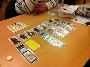 Einar kom smilende frem og introduserte seg for oss, og foreslå en runde med London. Han hadde et godt forhold til dette spillet, og truffet Martin Wallace i Essen. Ikke nok med det, men han fikk tak i et samlereksemplar av spillet, hvilket gir det hele en flott touch av finesse. I London skal man bygge ut sine bydeler i selve London. Men man må hele tiden passe på å ikke være for grådig, for da får man fort fattigdom i bydelene sine, og de er det ikke godt å bli kvitt – med mindre man har spilt det før. Einar tok fattigdommen og kastet det bort. I hans bydeler var det bare fryd og gammen, mens i Takras’ og Monicas bydel var fattigdom majoritet. London var et godt og velbalansert spill, der dyktighet og kunnskap om spillet har mye å si. Ingen tilfeldige vinnere her. Noen andre fant i mellomtiden frem klassikeren 7 Wonders og fikk med seg en god gjeng til å prøve ut dette. Kanskje tørrtrening til turneringen i morgen?