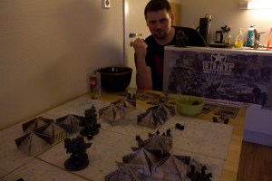 Takras forklarte reglene så godt han kunne, men det er klart at det kommer mange spørsmål og misforståelser underveis. Første runden vant Takras etter 3. runde, selv om vi egentlig skulle spilt videre. Vi visste ikke at Peter ville få forsterkninger etter 4. runde dersom han hadde flere folk på brettet – noe han hadde. Så da ble en ny runde startet, med samme scenario.
