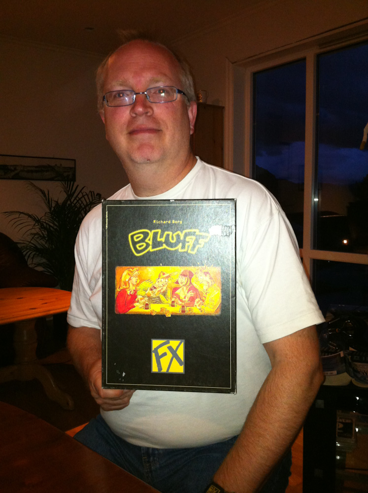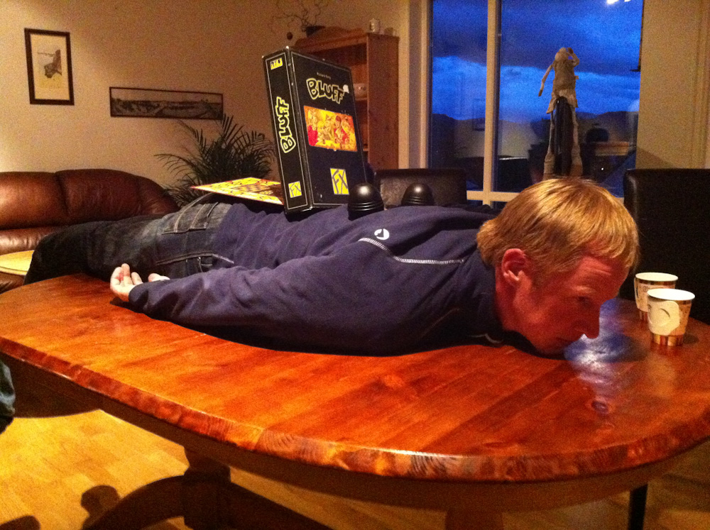 Kona til Sveinmain gikk tidlig i seng denne kvelden og dermed stakk han ut på en kveldstur, til Black ant selvsagt. Bluff ble foreslått, og dermed ble plutselig Hollender ekstremt trøtt, skulle tidlig opp neste dag osv. Han overlot plassen sin til Sveinmain og dermed var vi 5 som dro i gang dette spillet. Det ble en ekstremt treg start i 1.runde. Selv med temmelig høye bud, mistet alle kun en terning. Etterhvert eskalerte det litt men ingen røk ut slik tradisjonen er i dette spillet. Alle klamret seg fast med en terning hver, mot Black ants 4! Ant satte budet høyt, Sveinmain advarte Peter mot å se, men likevel åpnet han koppen. NEIIIIIIII! Alle fikk kollektiv straff da budet til Black ant var nøyaktig satt, og dermed mistet alle en terning hver og var ute av spillet på likt. Noe som aldri tidligere har skjedd i PG, og vi har spilt Bluff jevnt de siste 10 årene. Altså en historisk bragd.