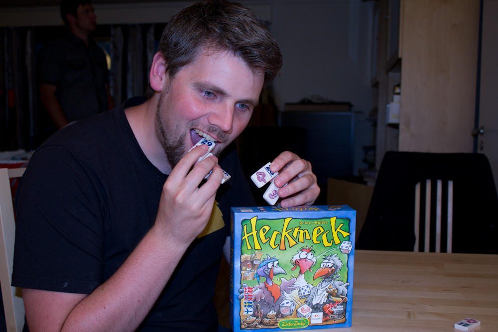 Da var det på tide med litt mer flaks. Heckmeck fra doktor Reiner Knizia ble kveldens avslutter. Til å være et så lite spill er det ganske morsomt, og det er spennende å se hva slags terninger man får underveis. Hvor langt vil du gå, hvor lenge klarer du å få det du vil? Og klarer du å få den nødvendige makken du så sårt trenger? Endelig var det Takras’ tur til å vinne, og han tok inn brikke etter brikke med poeng. Hollender var skikkelig uheldig med sine kast, og 3 ganger på rad fikk han absolutt ingen makker. Selv om man har ledelsen i starten kan spillet snu seg helt rundt og vise seg noe helt annet, og det er det som er så morsomt med spillet.