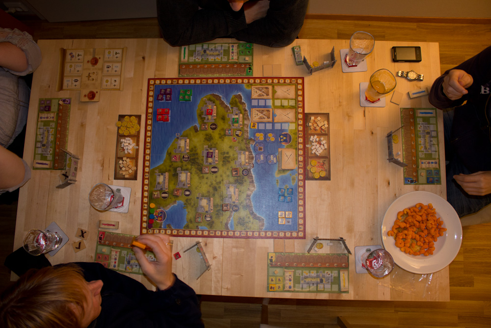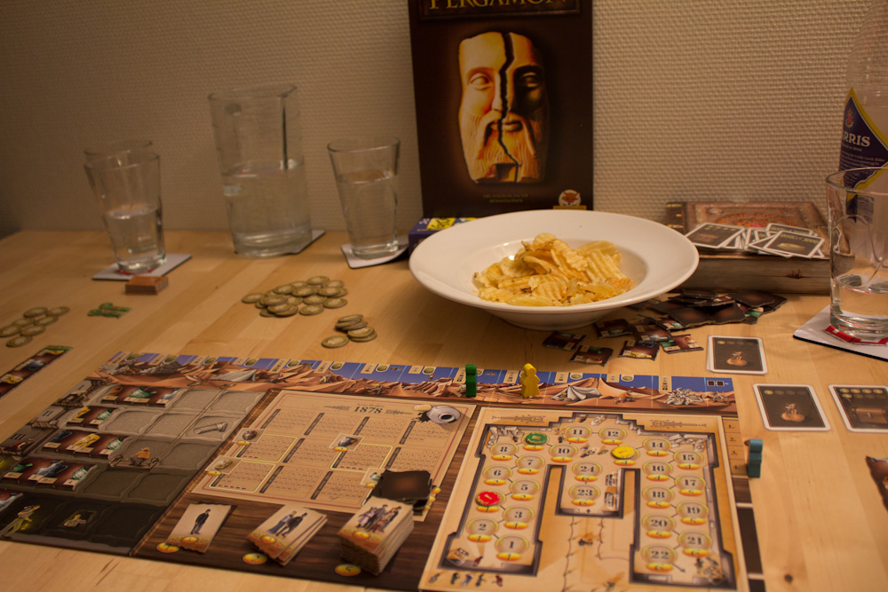 Kjappe spill på en halvtime? Takras fant frem Ascension. Det han ikke tenkte på, er at spillet er meget tungt med tanke på engelsk tekst. En øyeblikkelig hindring for Zuikis, så det ble ryddet bort til fordel for Pergamon. Nils ringt endelig og sa han hadde funnet veien. Tåken lå tykt, og da er det ikke lett å navigere seg frem uten GPS. 4 spillere til bords, og forretten ble gamle kunstskatter og utstilling i museum.