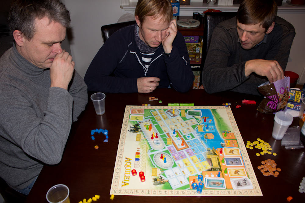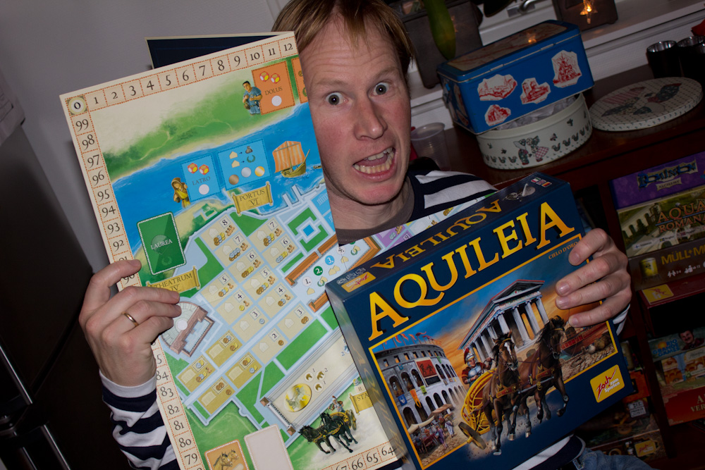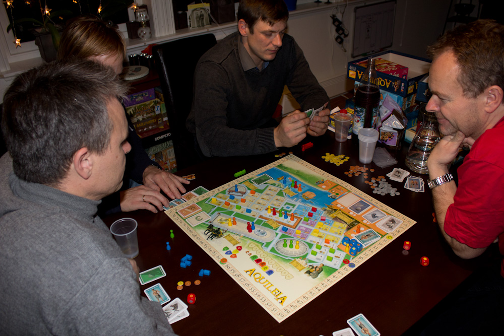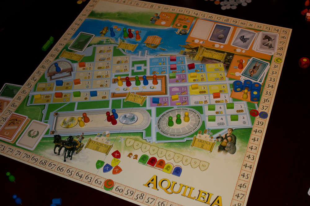 Men 5 spillere er jo perfekt for en kveld. Det finnes mange gode 5-mannsspill, og Takras hadde med seg nok et i kveld. Aquileia stod for tur. Her skal man kjempe seg gjennom gladiatorkamper og kjøre hest med vogn mot hverandre for penger. Men ikke glem slavehandel og utbygging av nye boenheter og fabbrikkvirksomheter. Men alt dette har begrenset med plass, og det er selvsagt ikke plass til alle. Dette er et worker placement-spill med viktige handlinger og meget begrenset plass. Mekanismene i spillet er også meget unike.