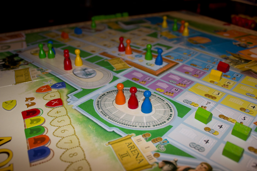 Main ble startspiller og satte i gang med pengeinntekt i første runde. Alt i etappe 1 på brettet ble valgt for og gæli, deretter var det slåsskamparenaene som fikk tur. Det ble et bygg eller to på måfå, men Main oppdaget fort at man måtte ha slaver også for å få det man ville ha. Han brukte jo slavene til å slåss i arenaen i stedet for bygging. Mange lærdommer første runde, og alle begynte å se viktigheten av å legge seg fremst på tie-breakeren. Etter en runde med faktisk spilling så satt de fleste handlingene i boks, og det er et meget oversiktlig spill. Main hadde planen klar og fikk bygd seg opp noen villaer, men slet med å samle inn kort for sluttellingen. Men da Saulius vant kampen i sirkus, strålte Main opp da han tydeligvis fikk noe som gagnet ham. I siste runde da alle hadde gjort sitt og vi begynte å gjøre handlingene, kom det plutselig fra Takras at han satte inn en av sine brukte arbeidere på nytt i arenaen til alles forbauselse – også hans egen. Det ble god latter rundt bordet, og Takras hadde falt ut litt av gangen denne site og avgjørende runden. Ny regel: du kan gjenbruke arbeidere. Neida!