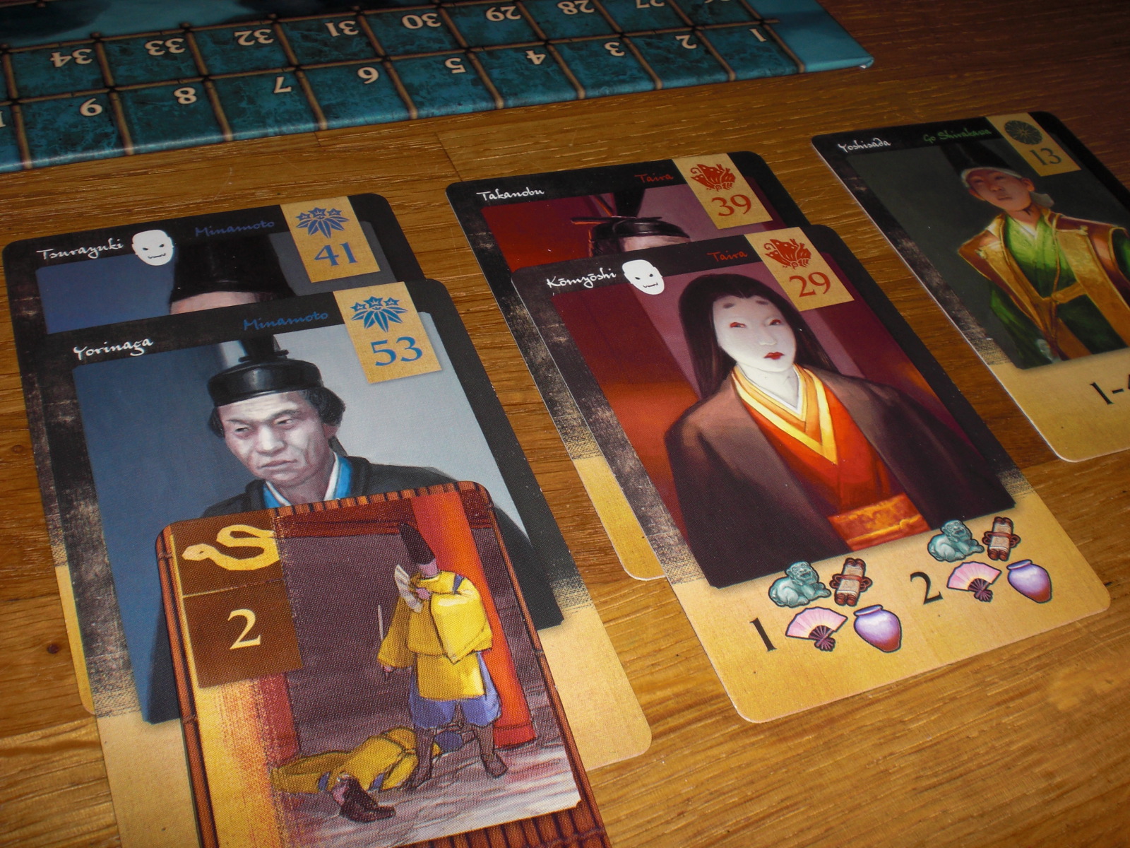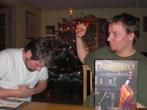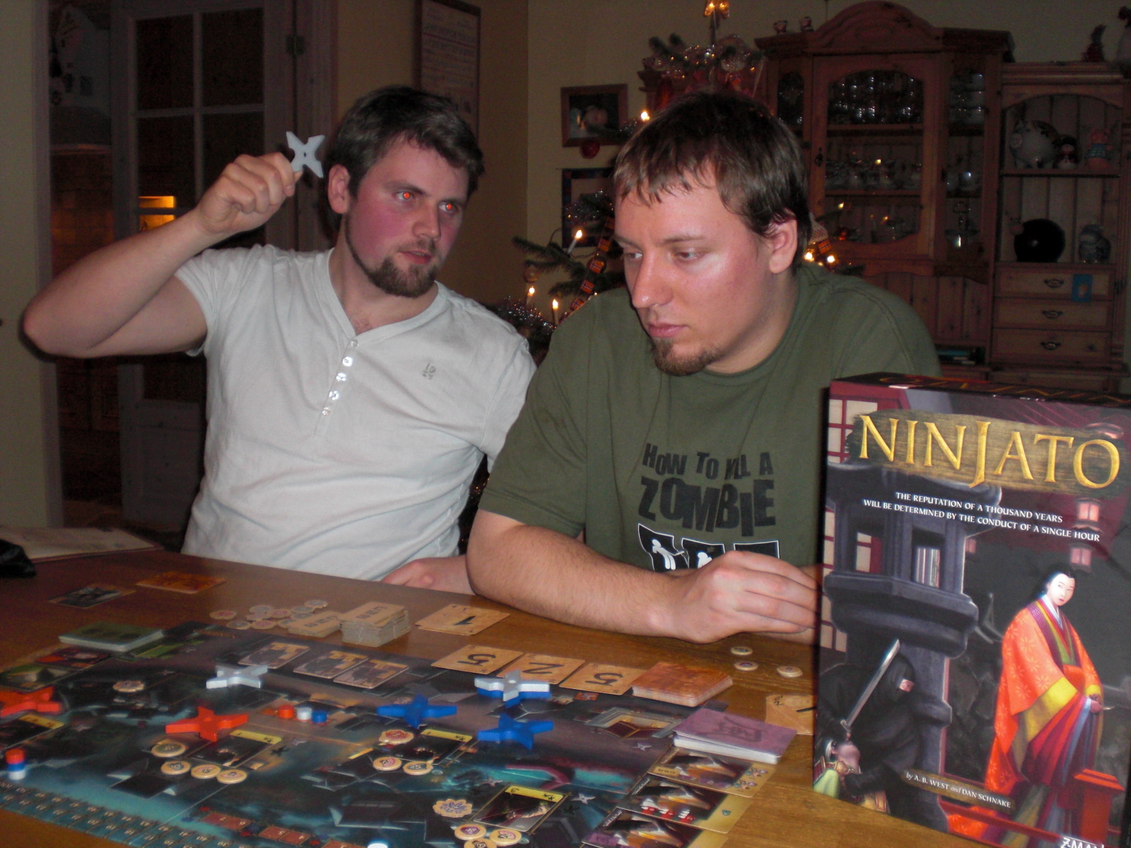 Så presenterte Takras sin Secret Santa-presang; Ninjato. I dette spillet skal man sette (eller kaste?) såkalte scorcerers på ulike plasser på brettet. Ved hjelp av disse kan man samle man skatter (stjele), oppgradere styrken, samle poengkort, få nye ninjakort, startposisjonen etc. Mange handlinger alstå. I starten så det noe forvirrende ut, men Takras gjorde en utmerket jobb til å forklare mekanismen og målet. Mens Hollender og Vegard spilte noe forsiktig, sikret Takras raskt 16 poeng.