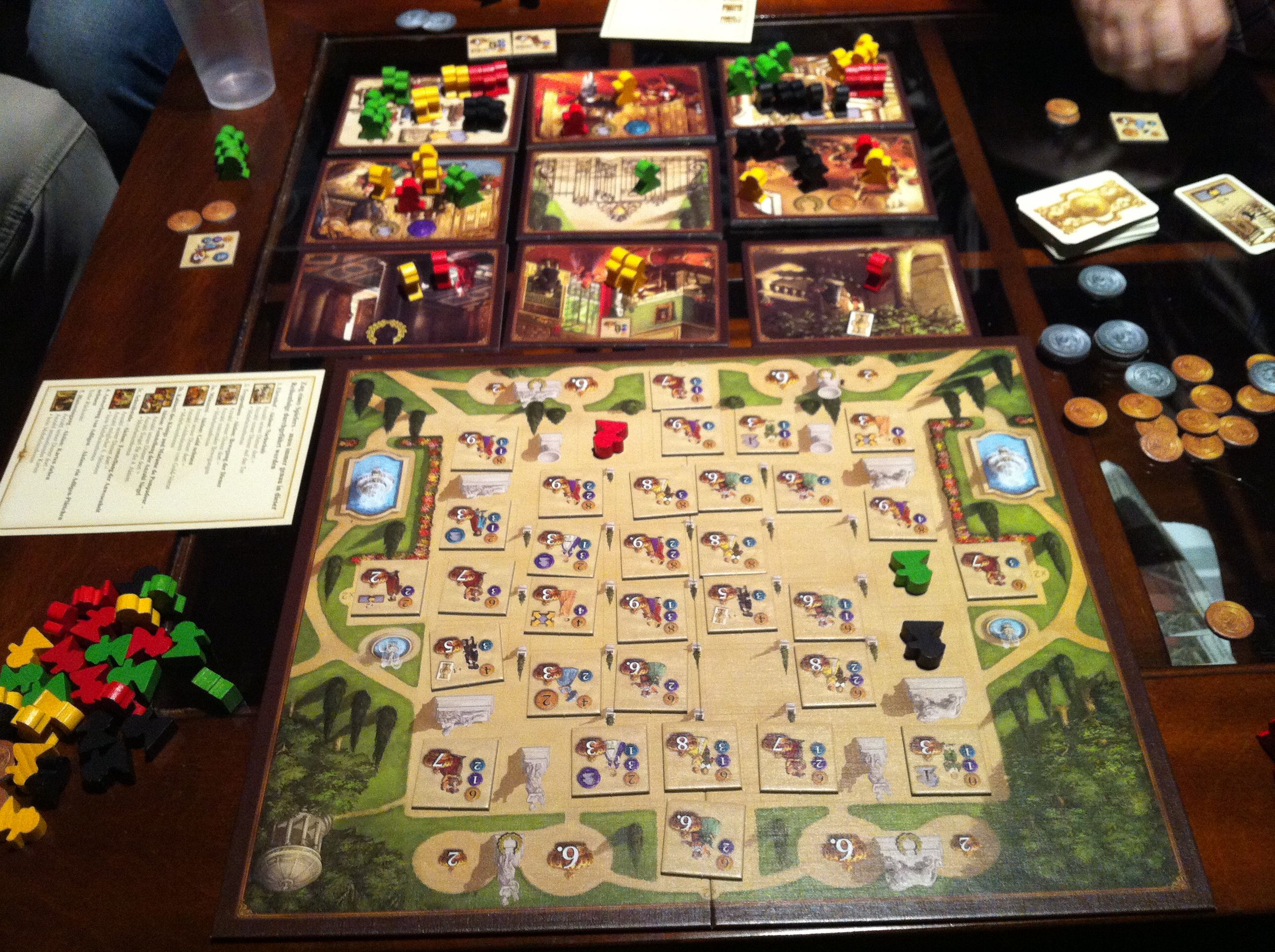 Til å begynne med sprang tjenerne fint rundt men etterhvert begynte det å bli knapphet på de. Da gjaldt det å spille klokt og prøve å gjøre det beste ut av hvert trekk. Sveinmain klarte å lure Peter til å kjøpe en brikke slik at Sveinmain fikk noen noble poeng, Hollender slet med å få poeng på brettet, mens Peter og Kim hadde mange fordeler hver. Derfor ble det spennende når det ble telling til slutt. Kim kunne heve Palasset over hode som vinner. 1. Kim 57 2. Peter 54 3. Sveinmain 53 4. Hollender 45.