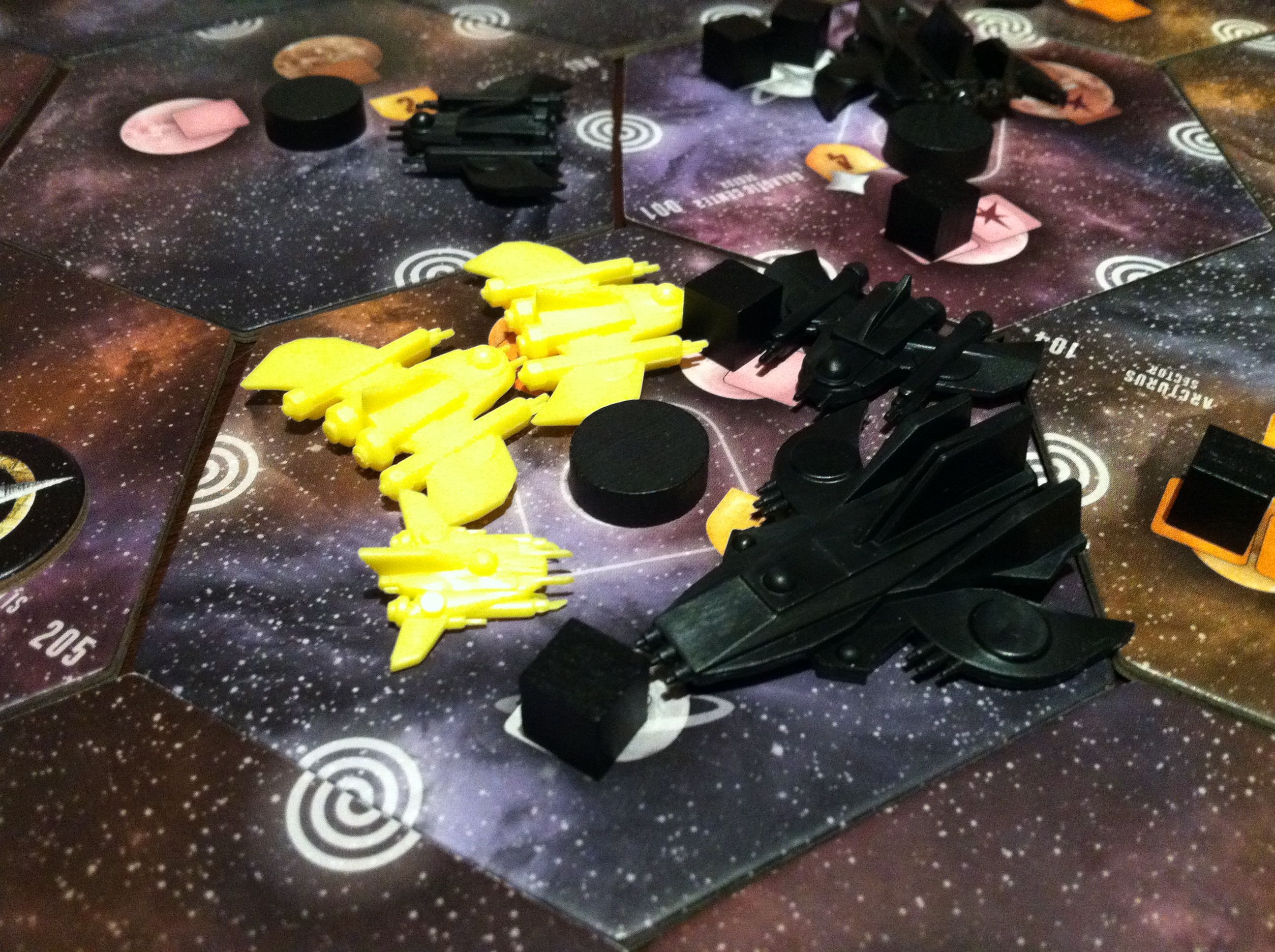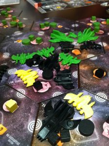 Corporalen fikk et lengre opphold uten konflikt, og kunne utvide seg slik han selv ønsket. Som en nykommer i PG så var dette en lettelse, da dette spillet langt overgår spill som Ticket to Ride i kompleksitet. Det kan vel neppe overgå ilddåpen hans hvor allsang på grenseland var det første han fikk bli med på. Men uten konflikt kom det flere tryglinger fra Takras’ side om hjelp. Men det var ikke nødvendig. Black Ant så at det var en trussel fra hans høyre side, og trakk seg tilbake. Samtidig så var det galaktiske midtpunkt et meget fristende område å ta over – litt mer fordi det var fristende å se om det gikk greit. Med hans skip og terninger, klarte han å påføre 7 skade etter første terningkast. Basen gjorde helbom, og Ant satt inn nådestøtet og pulveriserte forsvaret. I mellomtiden fikk Corporalen sjans til å oppgradere sine skip i forberedelse mot Ant.