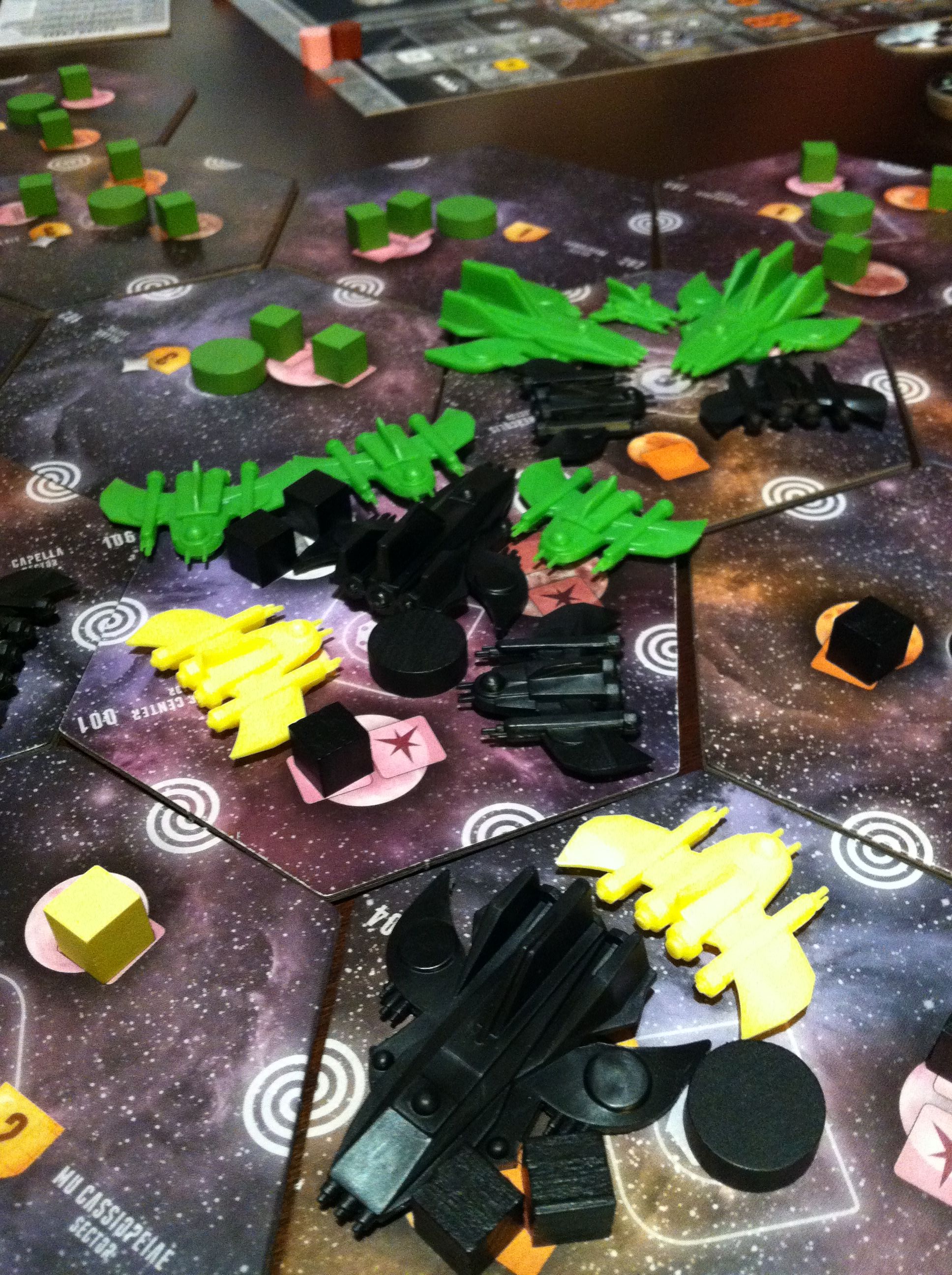 Eclipse slo godt an, og tar mye lengre tid enn det står på esken. Der står det 30 minutt per spiller. Er det i tillegg til 2 timer spilletid? Hele kvelden gikk med på dette forrykende krigsspillet, men tiden forsvant så fort at det ikke lot seg merke engang. Men det må absolutt prøves med 4 spillere, og teste ut hvordan diplomati passer inn i systemet.