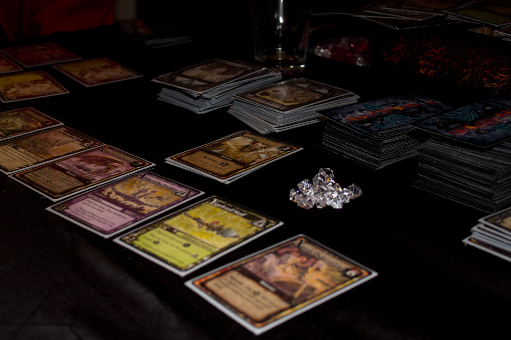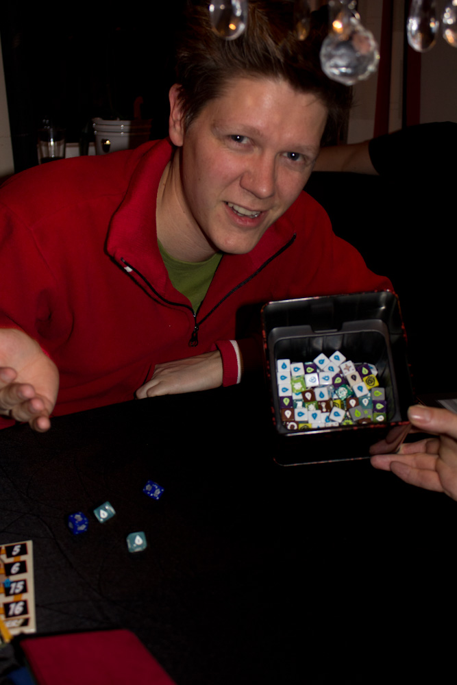 Ferdafolket Kim og Skillz ankom først, og de hadde plukka Takras med seg fra Tau. Forretten ble Quarriors! med Rise of the Deamons-utvidelsen. Flott spill med MASSE terninger. Denne gangen ble det mange dyre kort, og det ble de som var heldigst med monstrene sine som fikk poeng.