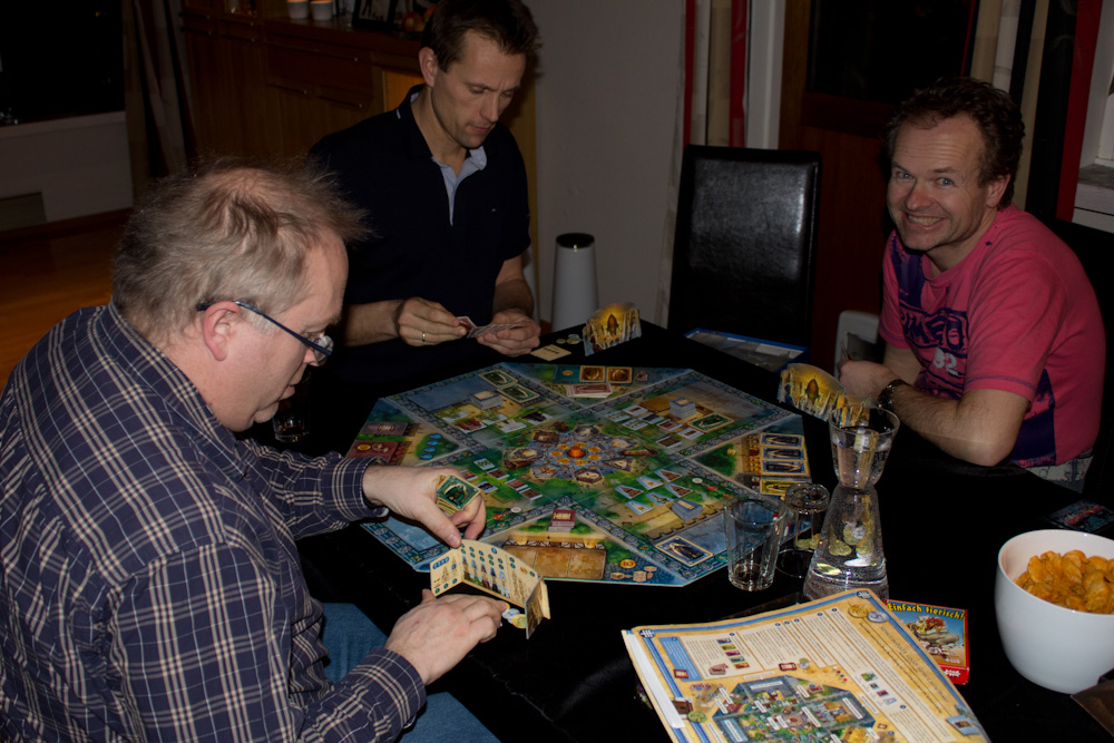 På andre enden av border hadde Black Ant, Hollender og Peter satt seg ned med Asara, som ble introdusert i PG i 2011 og kapret 2. Plass på lista over best likte spill. Noen mente sogar det burde vunnet. Black Ant har dette spillet som en av sine absolutte favoritter og har alltid gjort det skarpt. Peter hadde testet det en gang før og ville gjerne prøve igjen. Hollender var førstereisgutt og var spent på dette spillet som så mange hadde sansen for. Mye av taktikken i spillet går ut på å se hva de andre gjør og heller gjøre noe annet lurt samtidig som en gjør set litt vanskelig for andre. Videre er optimalisering av trekkene viktig mot slutten. Hollender mente flaksfaktoren når det gjelder farge på kortene var stor men dett kan kompenseres for ved å legge sine kort tidlig på feltene for å lage det vanskelig for de andre. Hollender var litt usikker på hva han skulle starte med, Peter hadde som alltid en plan mens Ant satset på mange og små tårn fra starten av. Dette gjorde at Peter og Ant fulgte hverandre tett på poengskalaen men Hollender lå litt bak. Hollender slet litt med å se forskjell på hele tårnbrikker og dersom var 2/3 store så han tapte litt tårnpoeng på dette. Hollender og Peter konkurrerte om det høyeste og flotteste hvite tårnet og tynte hverandre på det løpet. Black ant tok mange kort i siste runde slik at både Peter og Hollender var ferdigbygget mens han fremdeles hadde flere trekk til gode. Slik fikk han både flest tårn, kuppet høyeste tårn foran Peter og fikk mye poeng ellers. Dermed endte han en latsiden foran Peter i mål med Hollender på en respektabel 3. Plass.