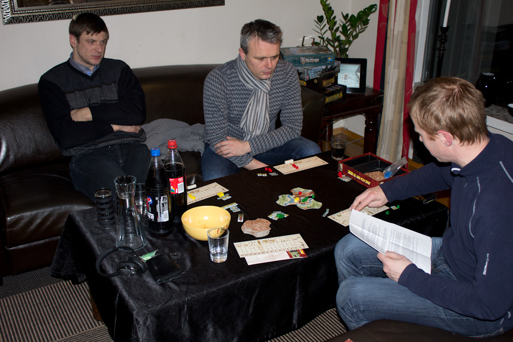 Kim var gira på å teste ut «Vodka og varme kilder», og dermed hev vi oss ut i det igjen. Spillbrettet ble tilpasset 3 spillere rundt bord 2 og vi satte igang. Reglene satt som støpt etter 1. runde og alle kom godt i gang. Med 3 spillere rakk vi å spille spillet helt ut til tross for spillets lille svakhet. Kim vant det hele og kunne feire med Vodka, med Saulius som nr. 2 og Sveinmain på en solid sisteplass.