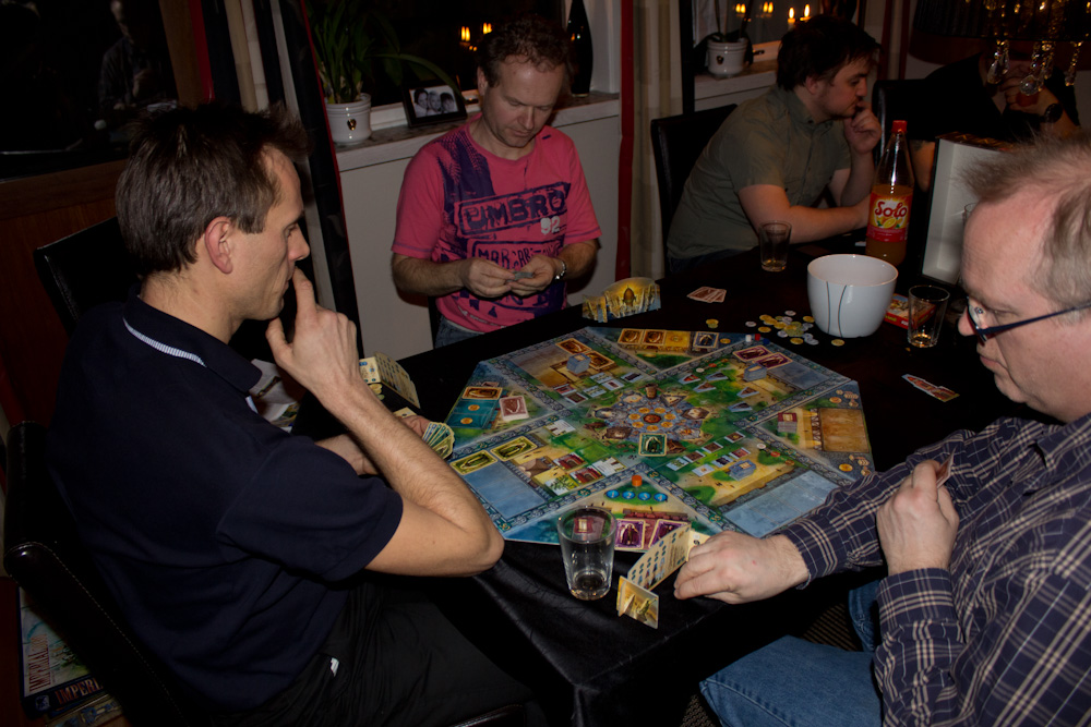 5 mann var igjen mot slutten av kvelden, og vi kunne samle oss i Boomtown for litt gruvedrift. I dette Auksjonsspillet gjelder det å by på sjefter som gir poeng og kanskje penger hvis terningene tillater det. Corporalen bød så det suste for å vinne en 7 er gruve som ville kolapse hvis noen fikk 2 eller 12, og fikk gruven han bød på. Men som vinner av auksjonen så skulle han få det ærefulle oppdraget å kaste terningene. 2 prikker, en på hver terning lyste mot han, til stor latter rundt bordet, og dertil skuffelse av Corporalen. Boomtown er stemningsfullt og relativt kjappspilt. Pift fikk noen innbringende Salooner, mens Corporalen fikk 2 borgermestre. Og så var det telling. Sveinmain ble utpekt til favoritt før fintellingen. Hans 66 poeng var det ikke mange som kunne matche, men Hollender hadde neven full av dollar, og dollar er som kjent poeng, og dermed vant han!