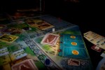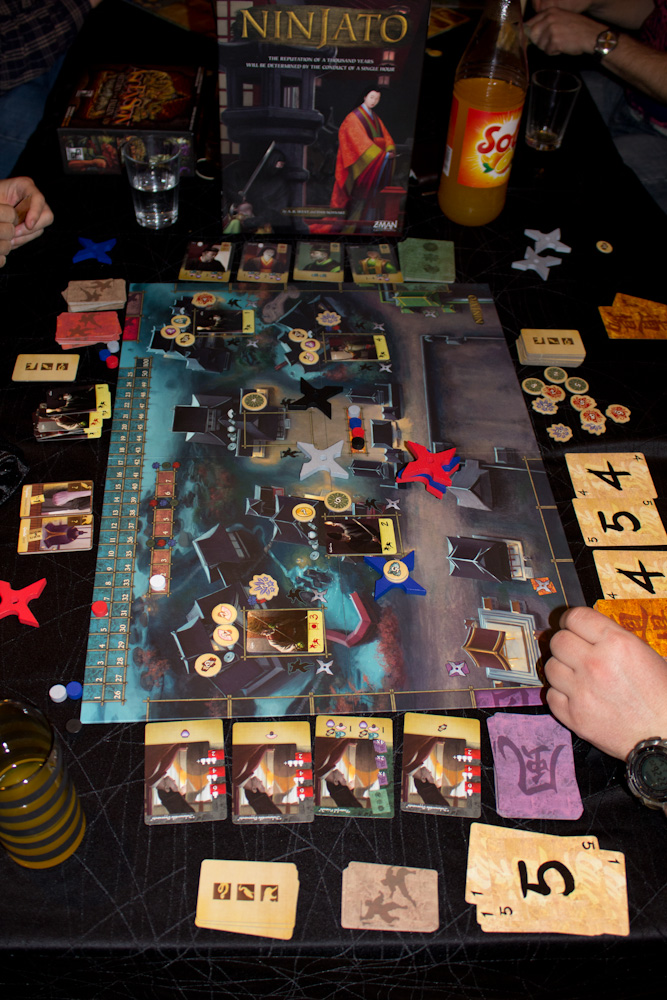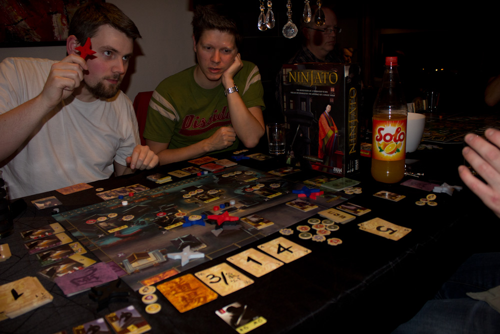 Ascension var fort ferdig, og etter mye frem og tilbake, ble Ninjato tatt frem som hovedspill på bord 1. Flotte komponenter, flott spillbrett og masse regler helt i begynnelsen. Helt fra starten har du mange muligheter, og det er viktig å vite hva de innebærer for å vite hva du vil gjøre i starten. Derfor kan det virke litt overveldende, med sniking, angrep, innflytelse, bestikkelse, vakter, alarm, elite-vakter, dojo, sensei, osv… Corporalen og Pift slet litt med å se sammenhengen i alt, men spillet var spennende og tida gikk fort. Altfor fort, for ferja nærmet seg med stormskritt og Skillz måtte snart kjøre sammen med Kim og Takras. De siste rundene gikk derfor i rekordfart, og Corporalen prioriterte å spille ferdig før han redda kona ut av badet der døra var gått i vranglås 🙂 Skillz kunne sette seg i bilen med nok en seier i boks. 1. Skillz 103, 2. Takras 85, 3. Corporalen 78 og 4. Pift ??. Men Ninjato er et flott spill, meget flott av utseende og gode handlinger som kan gjøres. Hele tiden føles fremgangen, med poengtelling underveis og bare 3 handlinger hver runde.ju