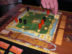 Sveinmain hadde tatt med Odins Table, som har blitt spilt i PG før: https://preikestolengamers.no/2012/01/07/vikingekveld-for-2/ Her gjelder det å klare å innta motspillerens hovedkvarter med 3 av sine guder før motspilleren klarer det samme. Hollender fikk en meget god starthånd i 1.