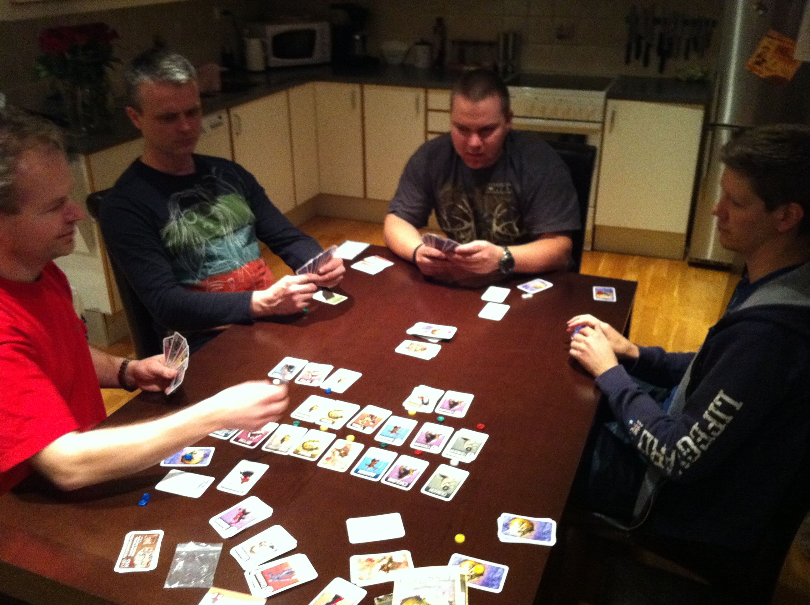 Mens Colossal Arena var i gang, så hadde hele 6 andre spillere ankommet scenen og satt i gang Vabanque. Dette slo ikke så godt an i fjor, men Sveinmain var skråsikker på at dette var bedre enn vi trodde, og fikk med seg alle på dette. I dette bluffespillet skal en dra på kasinoer hele 12 i stykket og legge igjen penger. Pengene blir litt spredt rund omkring, men selvsagt noen bord er mer lukrative enn andre. Så skal alle legge kort som enten er blankt(bluffekort), stjeler potten, eller dobler potten i sin farge og etter tur, med den rikeste som førstelegger. Så skal en flytte brikkene sine, noe som alltid gav stor stemning rundt bordet, før kortene snues og en ser hvem som tok vanlig pott, hvem som tok dobbel/trippel pott, eller rett og slett ble robbet, eller ikke klarte å robbe. Slik går spillet i 4 runder med stadig økende pengepott. Tineulty satt etter to runder med 0 penger mens de rikeste hadde nesten 200 000,- Mye av dette kan en takke hennes bedre halvdel Metalurgen for som til stadig stjal av potten hennes. Karoleena, Peter og Saulius stakk i fra de andre og det var ingen tvil før siste runde om at en av disse skulle vinne. Når de atpåtil i siste runde stilte seg alle på det samme kasinoet, var det bare stjelingen som kunne avgjøre. Sveinmain tok en råsjanse, og Saulius kunne smile hele veien til banken:-) Og det kunne Tineulty også, da hun i siste trekk kunne stjele hele potten til sin bedre halvdel og passere han på poengskalaen. 1. Saulius 570 000,- 2. Karoleena, 3. Peter, 4. Tineulty 240 000 5. Metalurgen 225 000,- 6. Sveinmain 170 000,- Vanbanque var godt likt rundt bordet og gikk unna på en halv time noe som er godkjent for et enkelt spill som dette. God stemning var det også for et bluffespill som funket utmerket med 6 spillere!