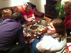 Sidissene – som forøvrig ikke er fra Stavanger – ankom med Takras på slep. For å få en tidlig start på kvelden så slang Takras frem Colossal Arena fra selveste Dr. Reiner Knizia. Dette er et veddemålsspill hvor man satser på mytiske skapninger som kjemper mot hverandre i en arena. 8 skapninger går inn i arenaen, men kun 3 overlever. Med mindre man går tom for kort. Spillet foregår over 5 runder, og en runde starter når alle skapningene har fått et kort hver. Kortene representerer styrken dems, og den med lavest styrke når en runde starter, den dør. Underveis kan man legge ned sinne stemmer, og vedde på hvilken skapning som overlever. Stemmer du i første runde, er hver stemme verd 4 poeng. Neste runde 3. Så jo lenger man venter, jo mindre verd er stemmen sin. Alle stemmene er åpne, så det opp til alle å sørge for at sine egne vinner. Men mye kan skje, for dine styrkekort kan bli erstattet med andre kort. På slutten er det 3 skapninger igjen, og vi teller poeng. Den som har mest, den vinner.