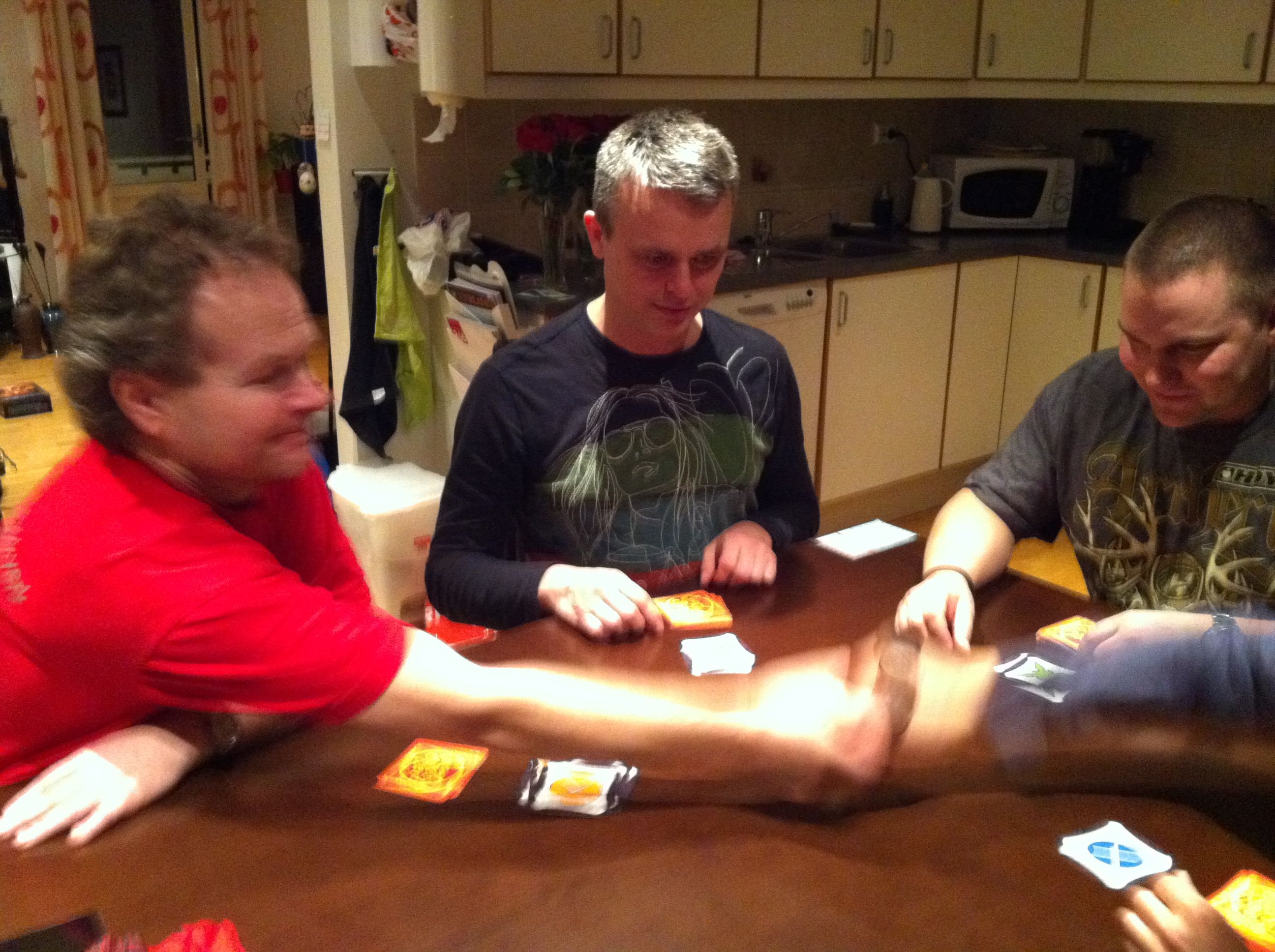 Siden Vabanque fremdeles var i gang men nesten ferdig, ble det en veldig kort filler på bordet. Nemlig Jungle Speed. Dette er et refleks-spill hvor man må identifisere symboler og være kjappest med å gripe totempælen i midten. Er man senest, får man flere kort. Og det handler om å bli kvitt bunken sin først. Et ekte PG-spill med andre ord. Kim vant uten å gripe etter totempælen en eneste gang, og Corporalen endte opp med halve bunken av hele spillet.