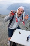 Så var det klart for musikkvideo. Nisseluer på og en del storøyde turister som dukket opp mens vi var der oppe. God steming og vakker sang ljomet over platået. Vi testet Preikestol-yatzee med terning utfor kanten, og Preikestol-kortspilling. Kortene blåste av platået og himmelhøyt opp i lufta. Et fantastisk skue. Takras var fornøyd men da var det såpass kaldt at alle beholdt luene på.