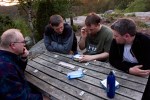 Gode og svette kom vi til toppen av Preikestolen akkurat da solen forot platået. Lite folk sent på kvelden så Sveinmain rigget bord på den beste fotoshoot-plassen helt på tuppen. Hva skulle vi spille? For å ta ingen sjanser falt valget på Qwirkle. Med tunge solide brikker skulle det mye til for at de blåste utfor kanten. Det var vel den mest stemningsfulle Qwirklerunden jeg har spilt. Og det ble meget jevnt på slutten. Sveinmain klarte akkurat å passere Saulius og vant det hele. 1. Sveinmain 113 2. Saulius 109 3. Peter 98 4. Vegard 92.