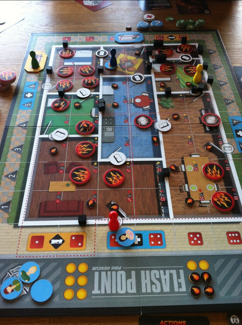 Men plutselig ble det dramatisk i House Hollender. Det tok fyr i huset! Heldigvis var det bare i spillet Flash Point: Fire Rescue. I dette spillet er hver spiller en brannmann, målet er selvsagt å løpe inn i et brennende hus, finne livstegn og redde ut dyr og mennesker i live. Noen ganger er livstegnene falsk alarm, og opptar tiden til brannheltene mens huset raser sammen. Hvis det går for lang tid, vil veggene etter hver bryte sammen og alt kollapser i hodet på alle som er inne. Det finnes to modus, nemlig familie- og ekspert. Vi begynte en runde på familiemodus der vi kutter ut noen elementer. Det ble knusende slakt av brannmennene. Vi fikk ut bare 2 ofre av 7.