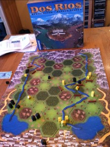 Også tid for eldstegutt å gå i seng, så bare Hollender og Takras var igjen. Hollender fant frem Dos Rios, sist spilt allerede i januar. Takras fikk en kjapp innføring og tok konseptet ganske fort. Hollender hadde en litt mer fremtidsrettet plan og plasserte sine arbeidere taktisk, før han endret elveleiet og sendte pengene sin vei og bort fra Takras’ arbeidere. Men Takras hadde også et ess i ermet, og fikk inn godt meg penger. Han fikk ut fire hus ganske kjapt, men så skortet det på pengene og demninger. Uten demninger er det lite kontroll å ha over områdene, og Hollender tjente en del på dette. Siste runde manglet Takras 100 penger for å ta inn vinnerstøtet, mens Hollender bygget sin siste finca rett foran nesten til Takras. Takras trøstet seg med at Hollender var startspiller, og at han selv ville bli ferdig rett etterpå.