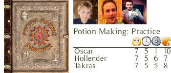 Yngstegutt skulle i seng, men Oscar skulle være med på ett til. Han så seg ut et spill, nemlig Potion Making: Practice. Takras har nylig fått to nye utvidelser til dette spillet, men de ble droppet for denne gang for å unngå altfor stor forvirring for en førstegangsspiller av spillet. Det er nemlig en del å forholde seg til av både symboler og noe tekst. Og det å se forskjell på elementer og oppskrift er ikke alltid like enkelt å få med seg. I starten begynte Oscar med å spille ut en oppskrift allerede fra tur én. Hollender slo til med akkurat det samme, og da var det ingen kort igjen til Takras, som ble tvunget til å spille ut et kort. De fem første rundene ble slik, og Oscar hadde fått to oppskrifter og Hollender 4, før Takras fikk en sjans til å vente to runder til, før han fikk ut sin først oppskrift. Men derfra ble det jevnt, selv om Hollender hele tiden lå 10 poeng i forveien.