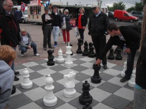Slik så det ut på Jørpeland Torg på lørdagen under Strandadagene nå på lørdag! Et yrende folkeliv og mange skuelystne da Torgsjakken ble offisielt åpnet. Sveinmain holdt en tale og svorne fans i fru Peter og Fru Main holdt snoren da en av Ryfylkes beste sjakkspillere gjennom tidene, Olav Skjæveland klippet den. Bare hornmusikken manglet, men her trenger en ikke slike forstyrrende elementer. Her skulle det spilles sjakk!