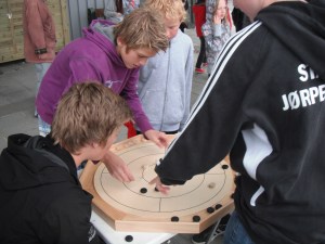 Mens sjakken pågikk hadde PG også stilt opp eget Crokinolebord. Det tok ikke lang tid før en del ungdommer inntok bordet, og der ble de likegodt sittende – lenge. Crokinole har en utmerket bare en gang til faktor, og det var trangt om plassen rundt bordet. Det ble mange spørsmål hva spillet het for noe. Kunne sikkert solgt noen eksemplarer hadde vi drevet butikk da…