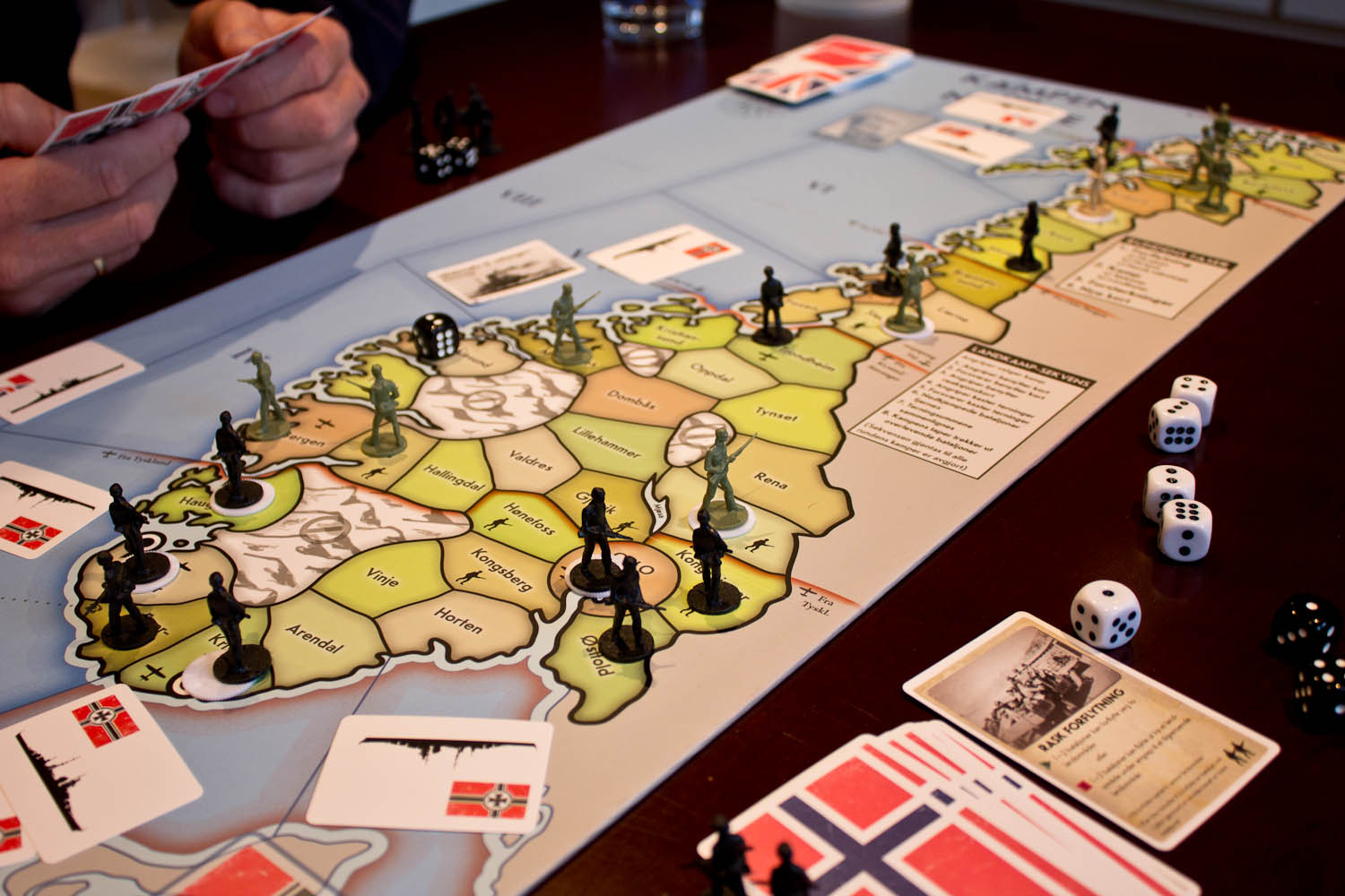 Sveinmain var foberedt til Takras’ nye ervering, nemlig Kampen om Norge. Han hadde en beret med det tyske flagget og var klar til dyst. Han ønsket å ta over den flotte nasjonen, og snudde ingen midler. Peter spilte svenskene (britene/franskmenn) og hjalp til Takras med å holde nøkkelbyene under norsk kontroll. Det er altså to mot en i dette spillet. Og alle spiller forskjellig. Hvordan kan dette gå?