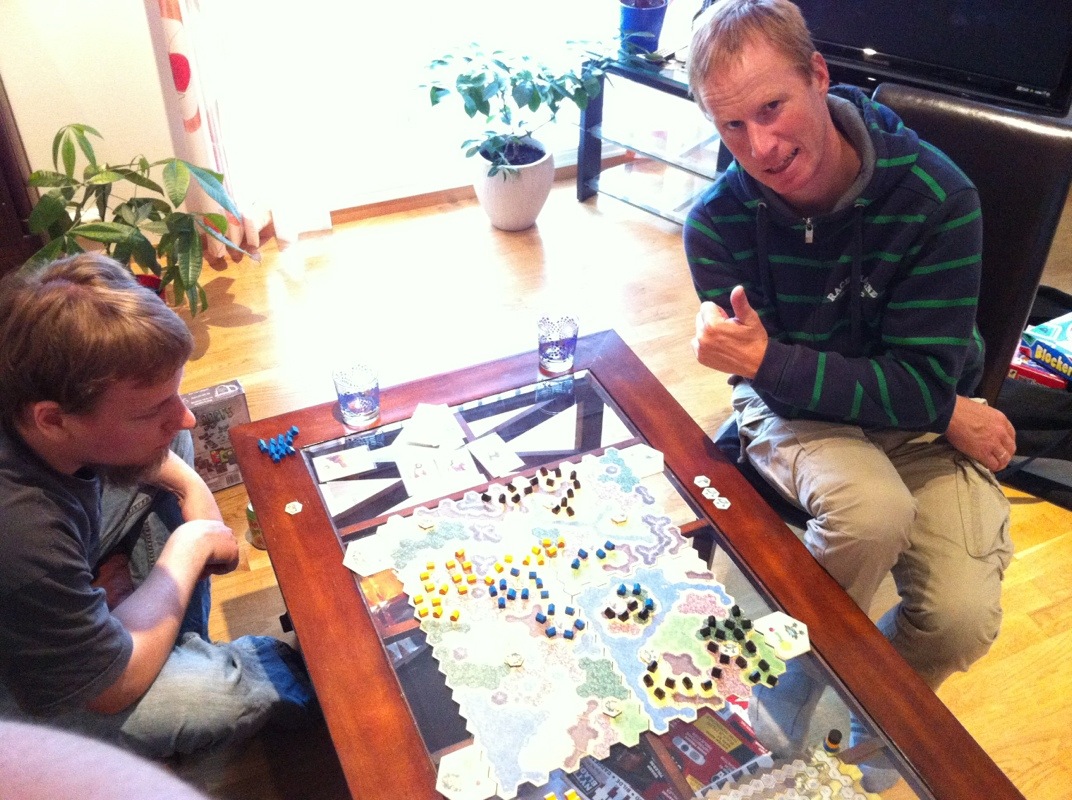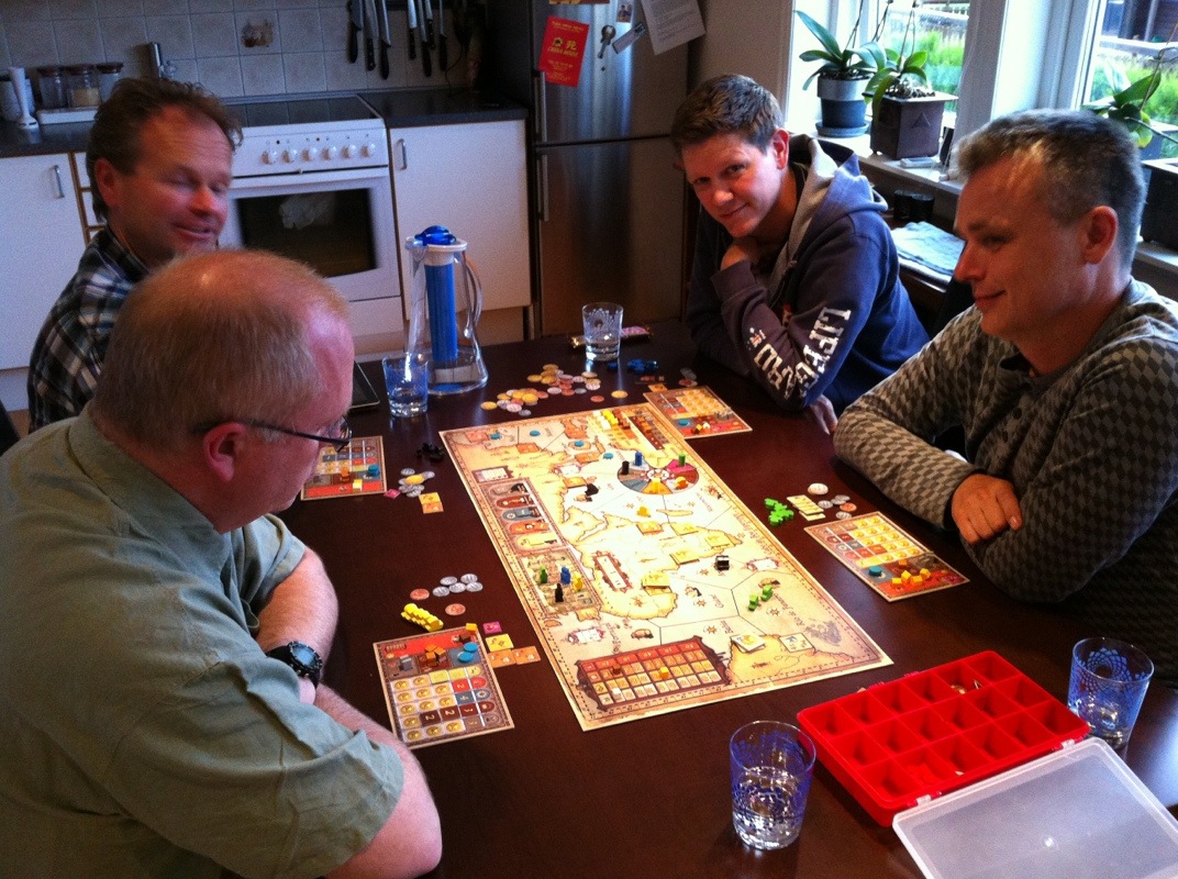 Hva er vel fellesferien til? Ikke reise, vel? Denne kjølige kvelden var perfekt for gaming! Peter, Vegard og Sveinmain joinet mannskapet, og det ble to bord denne kvelden. Funkenschlag med 6 på det ene, og Sveinmain alene på det andre. Eller så var det Kingdom Builder med Sveinmain, Takras og Vegard på det ene bordet. Detaljene er litt uklare der.