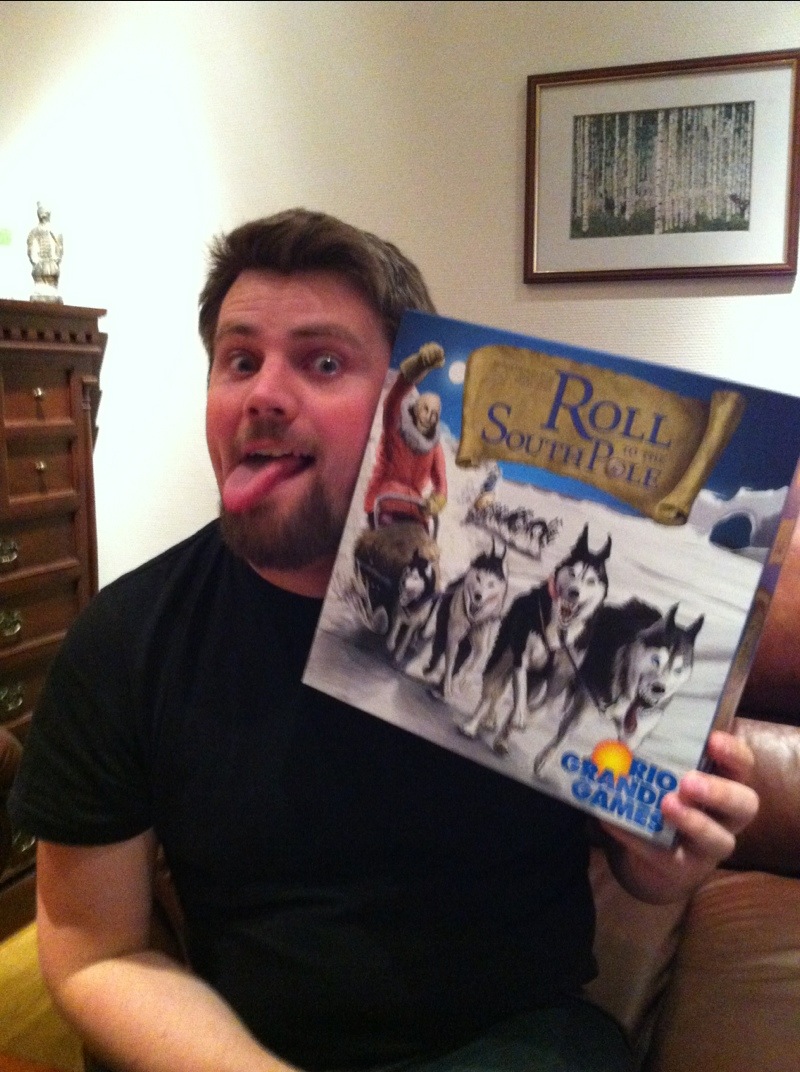 Roll to the South Pole fikk en ilddåp av Takras og Hollender. Den gang med feil terninger. Nå har Takras fått tilsendt et riktig sett fra Rio Grande Games, og dermed klar for å spille dette skikkelig! Reglene sier at det handler om å finne sydpolen først, og at de som kommer etterpå er det ingen som bryr seg om. Like brutalt som i virkeligheten, altså. Vet du hvem som var andremann på månen? Sveinmain fikk lov til å begynne, men klarte ikke første hindring og fikk dermed noen kuber som hjelp. Det gikk rundt bordet uten suksess, så Sveinmain fikk en pangstart med sine kuber til hjelp. Takras slet noe veldig med å komme seg avgårde, og banet vei til Vegard som gikk venstresiden mot syd. Sveinmain gikk mot høyre og nærmet seg flaggpostene først. Men Vegard klarte også en spurt-etappe og var like langt. Plutselig fikk Takras lykke med terningene og føk avgårde mot første flaggutsetting. Er sydpolen her? Nei. Er sydpolen her? Nei. Er sydpolen her? DER VAR DEN! Vi vet ikke detaljene i hvordan de fant sydpolen til slutt, men det føles som en litt merkelig måte å søke på. Både Sveinmain og Vegard viste frem alle brikkene rundt seg og fant ingen sydpoler der. Da gjenstod det få brikker rundt Sveinmain og Takras som kunne ha flagg, og det ble hos Takras.