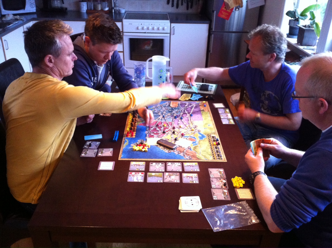 Slikt blir det to bord og gode spill av. Peter, Kim og Black ant gikk i kjent stil for spillet over alle spill – Funkenschlag og fristet Skillz. Han vaklet mellom dette og de andre men da han så menyen på det andre bordet (light-spill 😉 )landet han elegant med en runde energidealing han også. Grunnutgaven med utfoldelse i USA ble valgt og satt opp. Alle var godt røynde fra før så her var det bare å kjøre på. Skillz var først ute og bygde på østsiden av midten (dyr passasje mellom øst og vest på brettet). Ant gjorde det samme mens Kim satset på midtvesten. Peter var sist ute og bygde også på østsiden av midten, langt oppe i nord. Dermed var Skillz omringet og Kim kunne utfolde seg i fred i vest. Som alltid ble det en jevn stigning før noen saftige sentraler dukket opp. Her ble det bying mens noen lå litt på været og satset på røverkjøp. Så skjedde det som ofte skjer i Funkenslag – de store sentralenes tid var omme og bare småtteri dukket opp. Og slik gjekk no dagan…. De som hadde sikret seg noen saftige sentraler fløt godt på de mens de som hadde ligget på været ikke fikk økt kapasiteten fordi bare puslesentraler dukket opp. Alle tjente penger selv om noen tjente mer enn andre. Når grøden var rik gikk Peter for det åpenbare vinnertrikset i slike situasjoner. Han hadde mest kapasitet på sine sentraler. Dermed ga han flat pedal og bygde 17 byer og avsluttet spillet. Ingen var i nærheten av å forsyne 17 byer men Peter var nærmest og vant med det !
