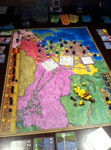 Hehehe, da stufe 3-blunderen var et faktum fikk jeg et realt flashback til den forrige Funkenschlag-seansen hvor Kim «hadde sett at vi hadde gjort noe feil» og Main kom tuslnede bort og påpekte at det jo var et spill vi ikke hadde spilt SÅ ofte så det var å forvente at man gjorde en del feil i opplæringsfasen… 😀 😀 😀