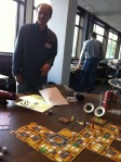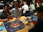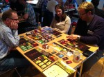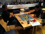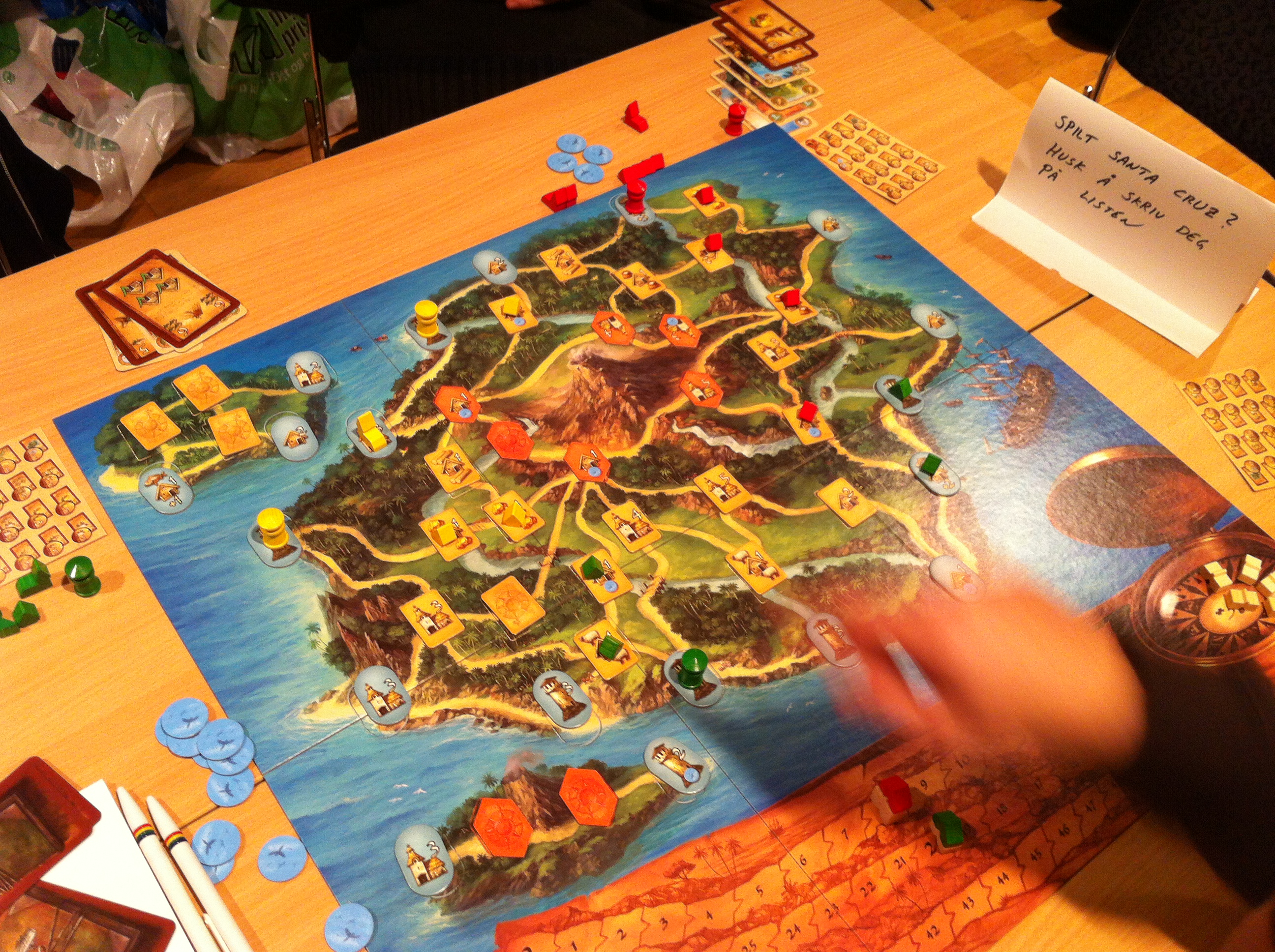 Santa Cruz. Dette var et av de store nye spillene. Arrangementet var lagt opp slik at de som lærte seg å spille dette og spilte en runde, de ble med i trekning av et spill fra premiebordet. Dette for å få oss til å lære spillet videre og skape litt reklame. Vi leste reglene, men spilte litt feil i første runde. Jeg mistet alle mine bygg tidlig, da vulkanen fikk utbrudd. Det var en kjip opplevelse, og følte jeg bare var med på resten av turen. Vi har kort på hånd som bestemmer om vi kan bygge på vei, sjø eller elv, inntil allerede plasserte bygg. I tillegg har vi poengkort som gir poeng til alle som har oppfylt kravene, så timing her er viktig. Alle kortene skal spilles ut, så alle har mulighet til å få poeng. Men det var meget tørt, og handlingene føltes meningsløse til tider. Vi spilte gjennom 2 runder, men ble ikke imponert. Kort spilletid og lett å lære, det er et pluss.