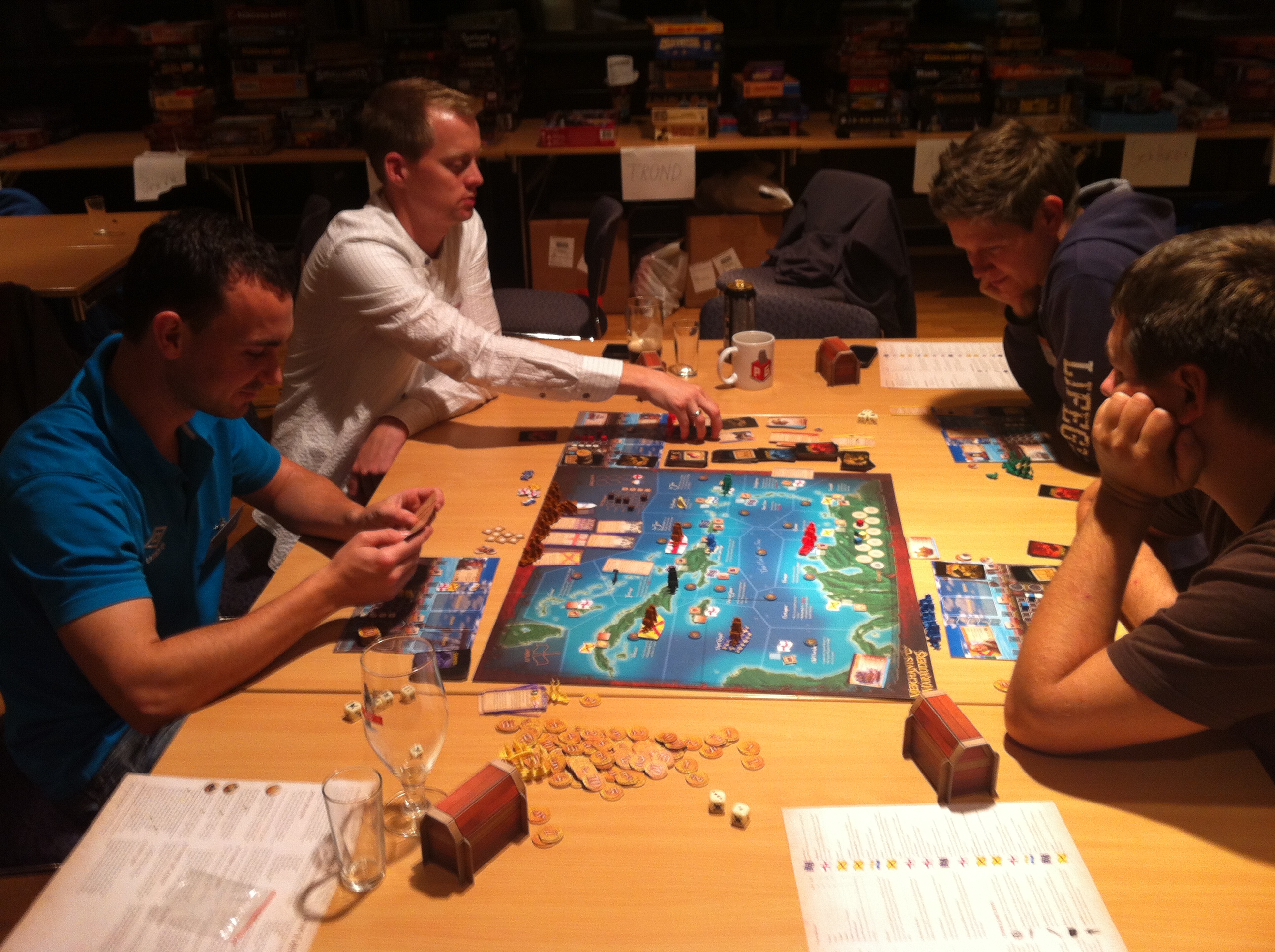 Hansa Teutonica. Første gang for meg. Nå merket hodet mitt at det var deilig å spille kjente spill enn å lære et nytt. Jeg er glad i tema, og fant fort ut at handlingene i spillet hadde ingen ting med tema å gjøre, det var bare å få tak i nye fordeler ved hjelp av abstrakt utplassering av brikker. Derfor jeg ikke har gjort store anstrengelser for å prøve dette spillet fra før. Men som vanlig blir jeg positivt overrasket, og dette spillet var veldig godt utført. Lett å forstå handlingene og hva som må gjøres, men vanskelige valg underveis, avhengig av hva andre spillere gjør. En fin mengde interaksjon, og flere veier til seier. Likte dette veldig godt.