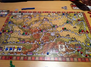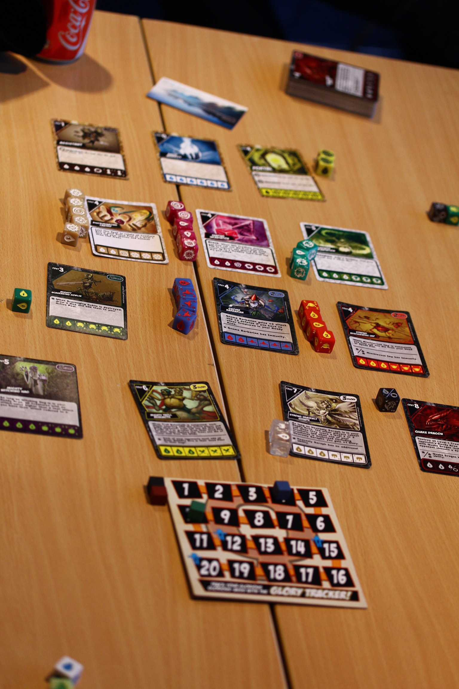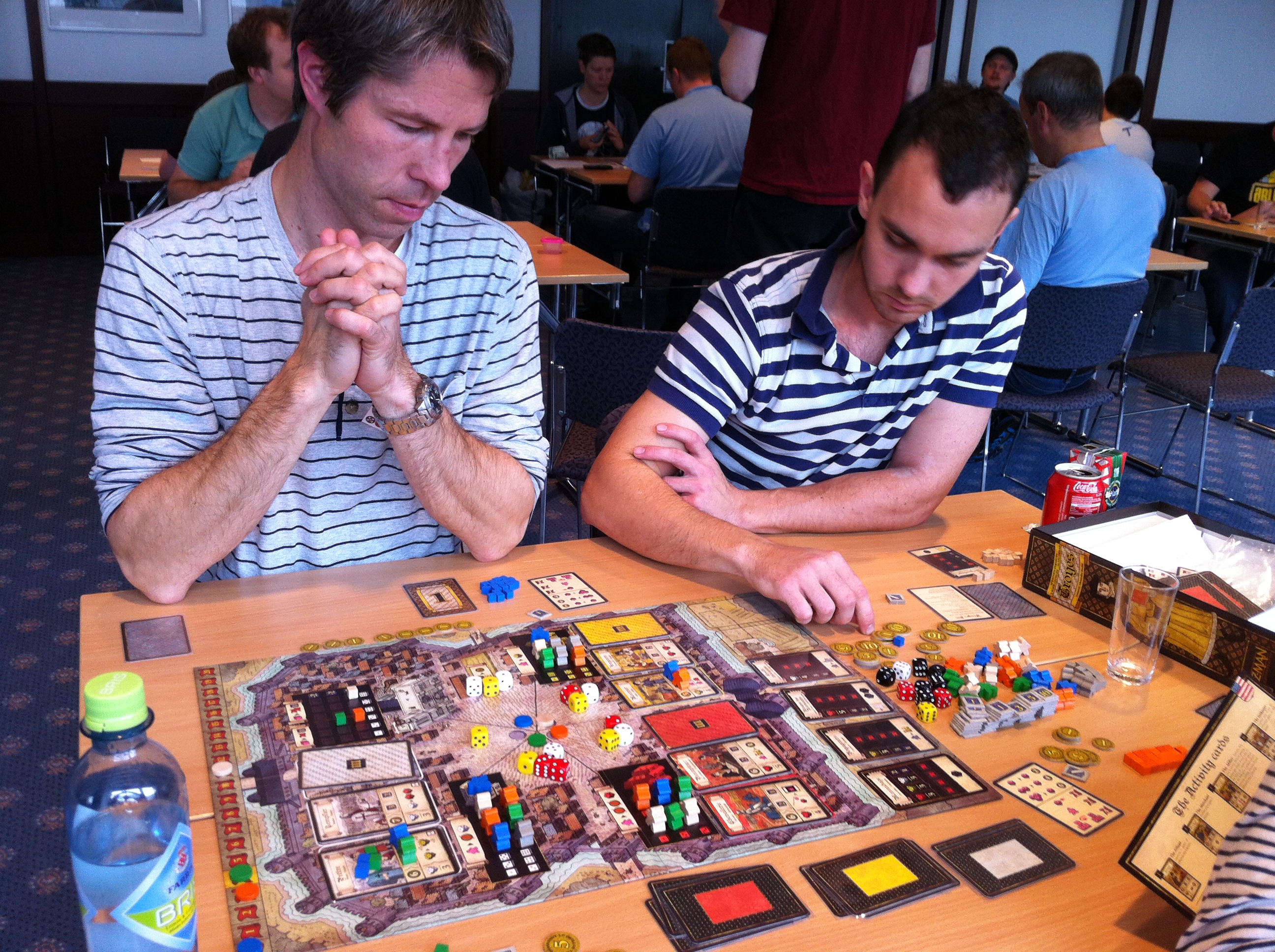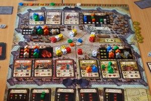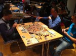 Troyes. Med 4 spillere og 3 som ikke hadde spilt det før, ble det regeltid. Noen ville bare gå rett på sak og lære underveis, men klok av erfaring så tok jeg en grundig regelforklaring likevel. Her er det mye å holde orden på. Egentlig et veldig lett forståelig spill, men ikke alltid lett å se sammenhengen, ikke ulikt Mage Knight. Det er mange utfordringer og muligheter her, og tross terningkast, så er det mindre tilfeldigheter her. Alle må tilpasse strategi hver runde avhengig av terningene, men de forblir uendret gjennom runden. Det tok et par timer, og en av dem slet med å skjønne hvordan han kunne bruke kortene han hadde kjøpt seg inn på, gjennom resten av spillet. Det ble lite krig i begynnelsen, og derfor mye straff. Jeg vant med bare 1 poeng.