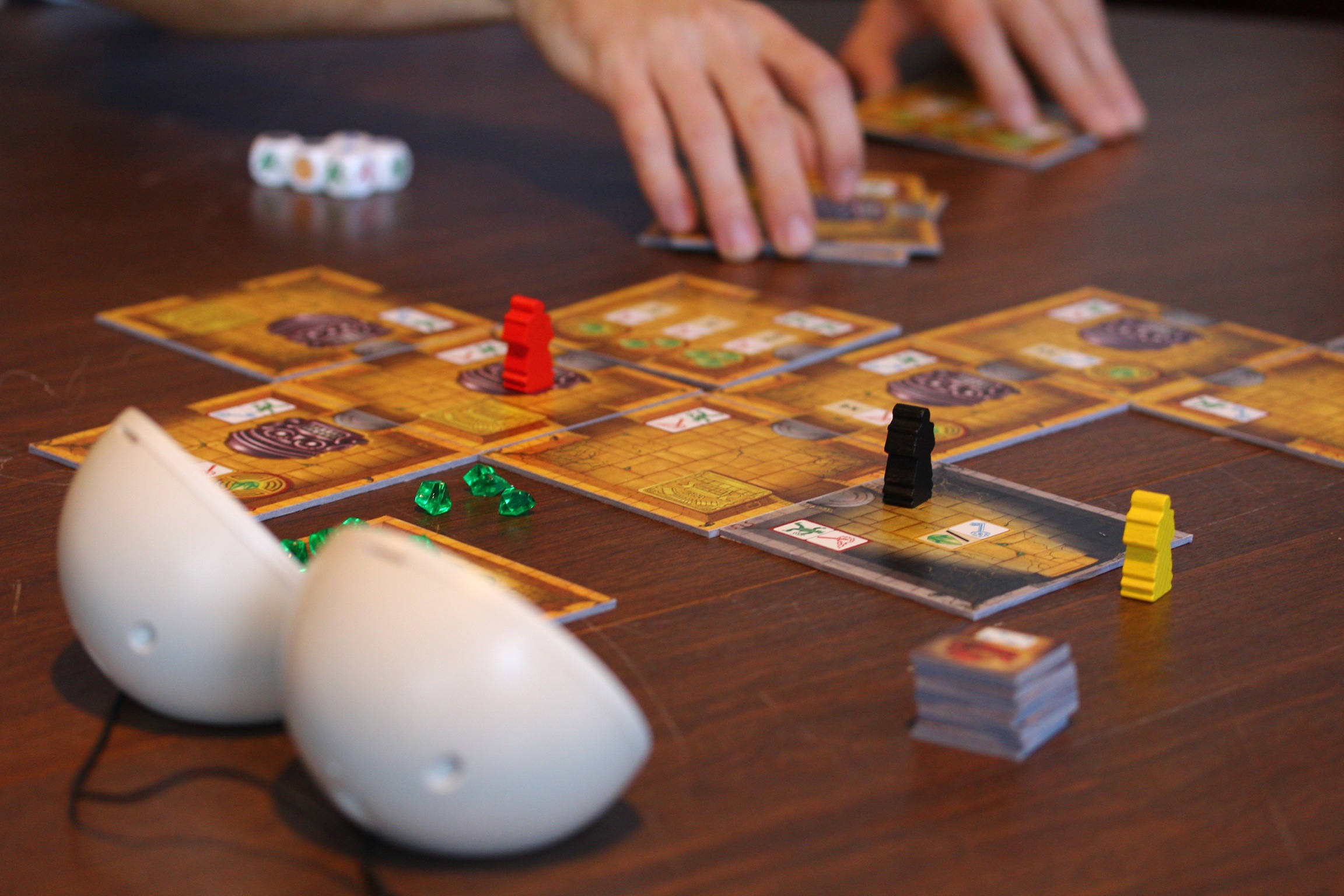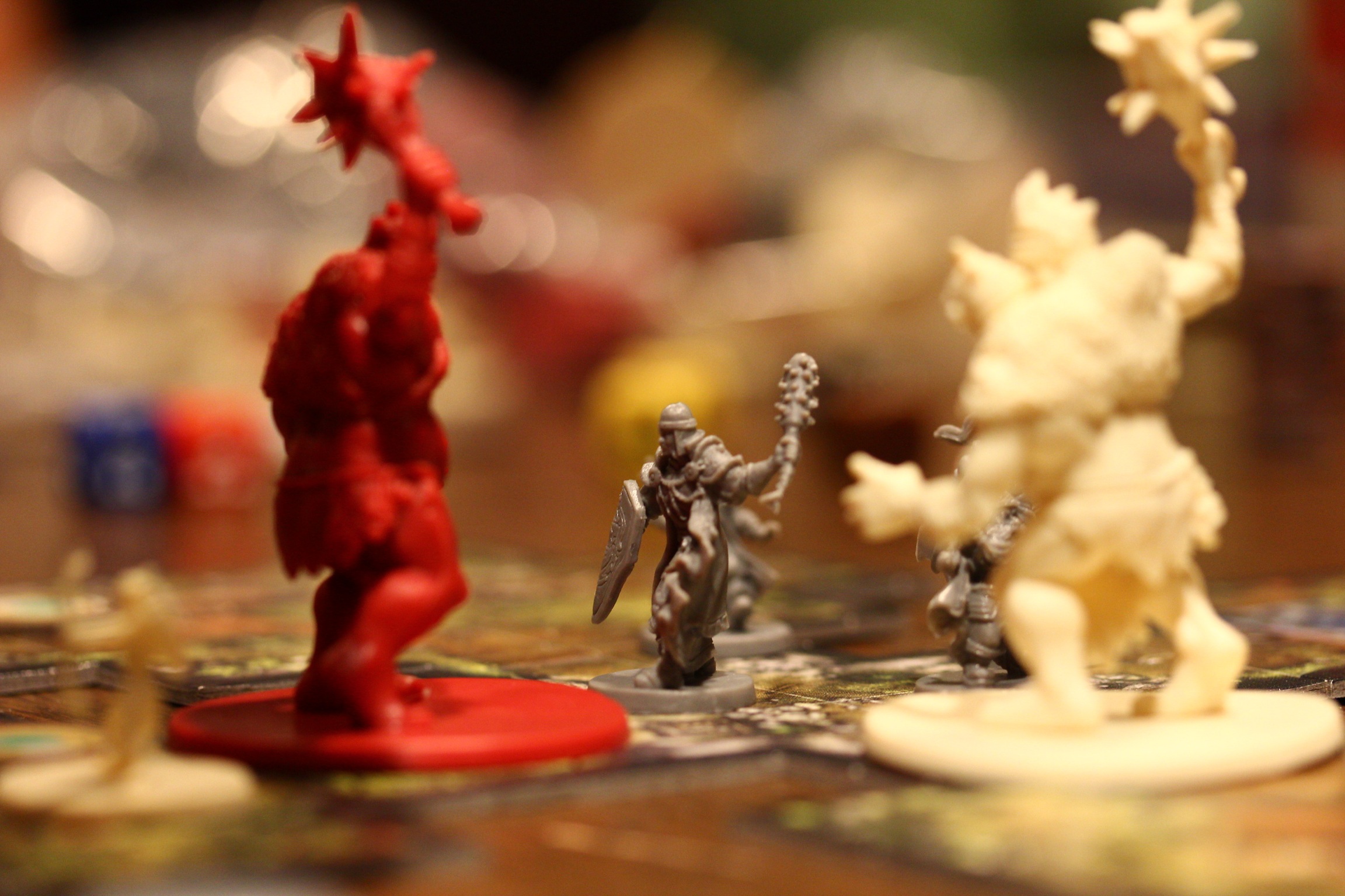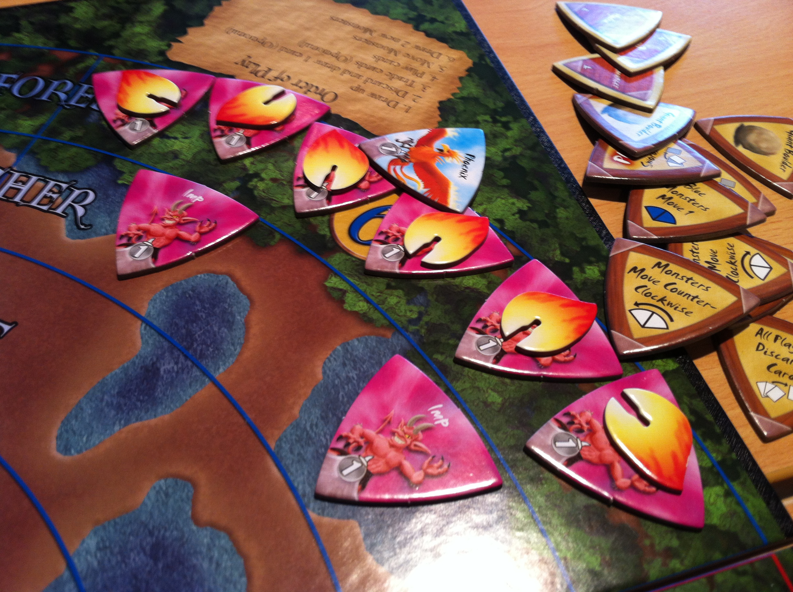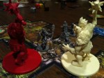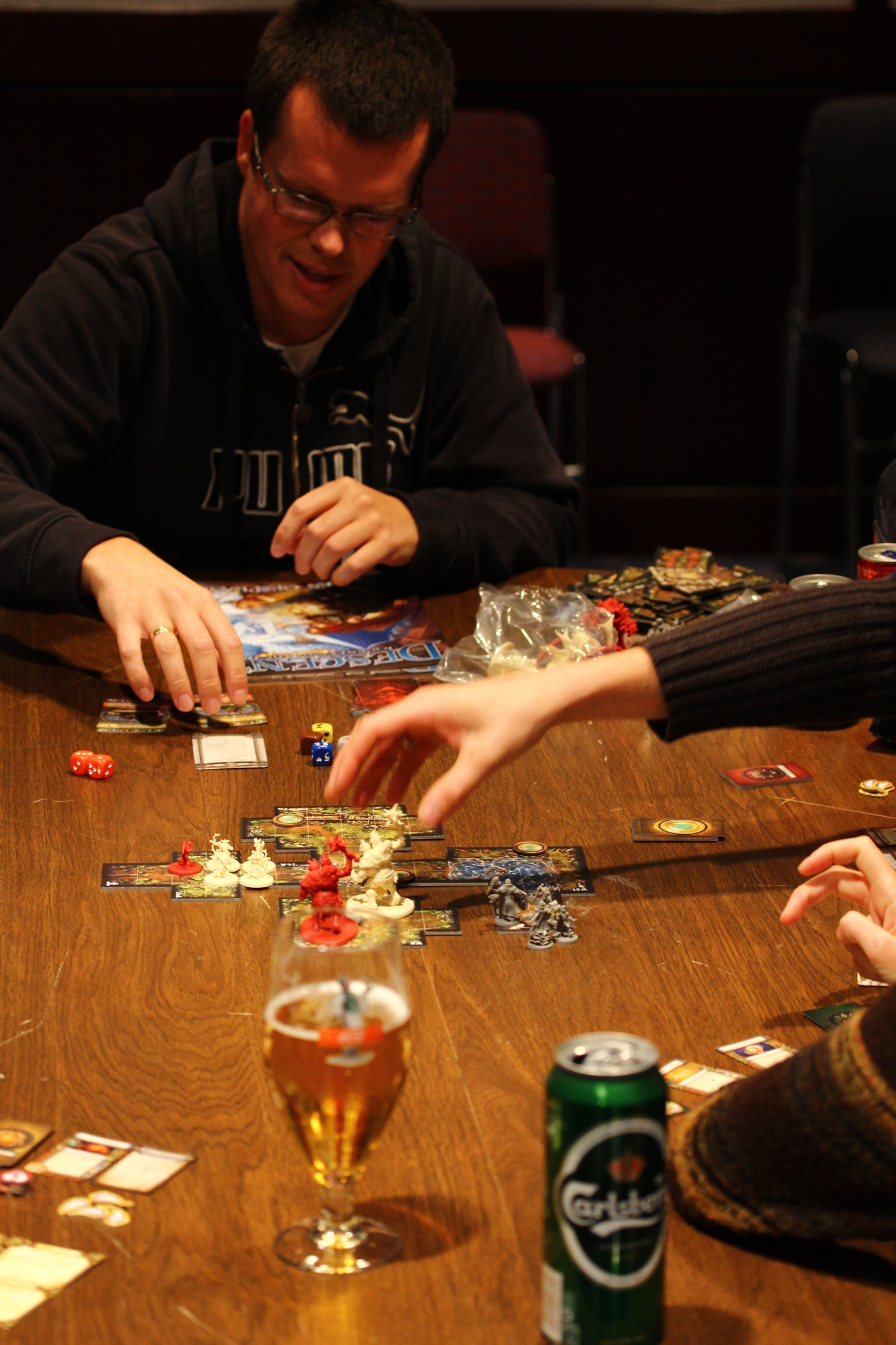 Dungeon Lords. Nappeto hadde lyst å prøve dette etter litt omtale fra meg. Her skal vi spill som den onde fyrsten som bygger dype huler og plyndrer landsbyer. Det foregår i to perioder som er et år hver, og på slutten av året kommer det fæle helter og prøver å ødelegge det du har bygget opp. Regelforklaringen kan være litt voldsom, så jeg begynte med kampreglene først, da disse kanskje er det viktigste i spillet, siden det påvirker det meste i hulen. Prøvde meg på litt bakgrunnshistorie til spillet, men vet ikke om det gikk inn. For meg får jeg litt innlevelse i historien bak mekanismen, spesielt siden spillet er basert på det utrolig stilige PC-spillet Dungeon Keeper. Jeg vant absolutt ikke, og Mandy som var snillest i dette «onde-spillet» gikk av med suveren seier. Flott spill.