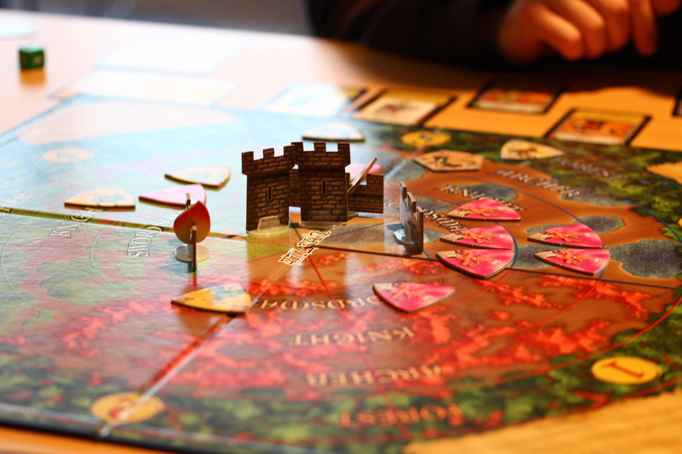 Castle Panic, med utvidelse. Utrolig uforutsigbart og tilfeldig samarbeidsspill. Har spilt dette mange ganger før med 2 spillere, og syns det er et morsomt spill. Det finnes ingen «beste plan» i dette spillet, det handler om sannsynlighet for hvilke kort som trekkes, og hva som ligger igjen av monsterbrikker i posen. Men det føles som om vi har kontroll over situasjonen, og at valgene vi gjør er de riktige. En falsk følelse av kontroll, men det passer godt med temaet, og det er litt panikk underveis. God tittel og morsomt spill. Tapte 2 ganger.
