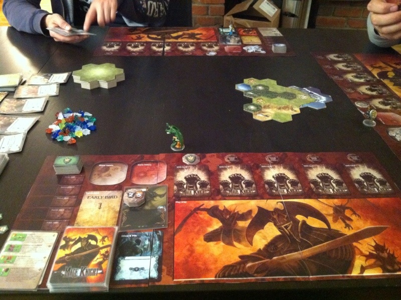 Men hva med det andre bordet? Skillz og Takras hadde på forhånd avtalt å spille Mage Knight i kveld hvis oppmøtet tillot det. Og sannelig, med 7 spillere så gjorde det nettopp det. Marog meldte seg glatt frivillig til dette storslåtte spillet, hvor vi er sinnsykt kraftige krigere fra en annen dimensjon, hvis eneske ønske er ære og berømmelse, uansett hvordan det oppnås. I Mage Knight har alle en lik bunke med kort, med unntak av ett. I løpet av en runde har en av oss brukt opp bunken, men før den er tom, går det på turer.