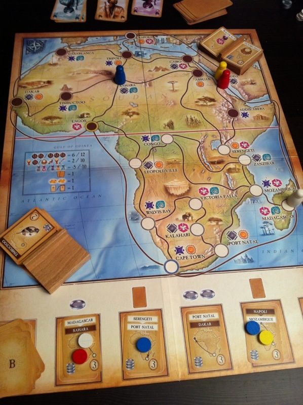 Styrmann hadde et ønske om å teste Africana, et meget vakkert spill som handler om, ja – nettopp Afrika. Her var vi oppdagelsesreisende fra hver vår nasjon som skal oppfylle oppdragskort, og samle skatter på det afrikanske kontinentet. For å flytte seg må en ha kort, og for ha kort må en velge kort som handling. Men får en tak i tjenere som kan brukes igjen og igjen så sparer en tid. Det ble litt leting til å begynne med hvor de forskjellige byene lå, men etterhvert så satt det sånn nogenlunde. Det ble en del reising fra nord til sør, og desto flinkere du var desto mer penger fikk du til å kjøpe skatter som igjen gav mere penger. Etterhvert var det ikke flere skatter igjen, og spillet ble avsluttet. Det var duket for telling. 1. Sveinmain 56 2. Styrmann 51 3. Karoleena 43 4. Peter 40.