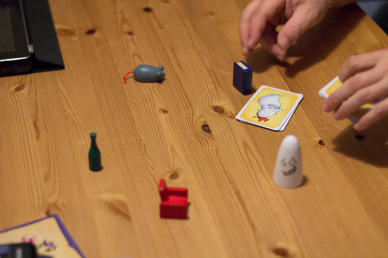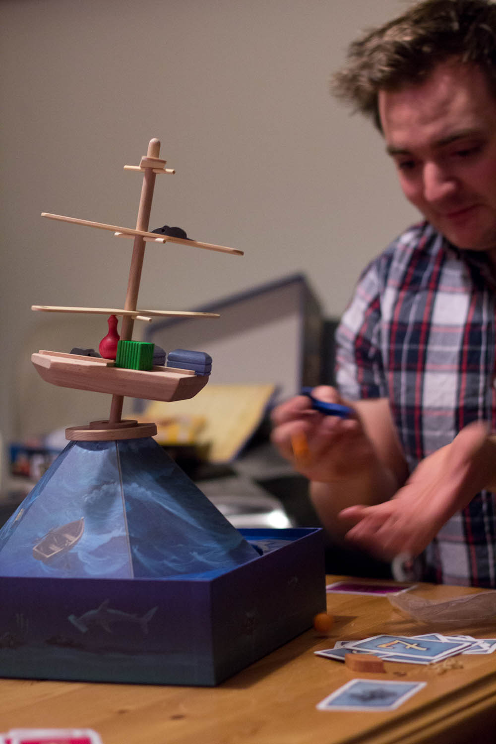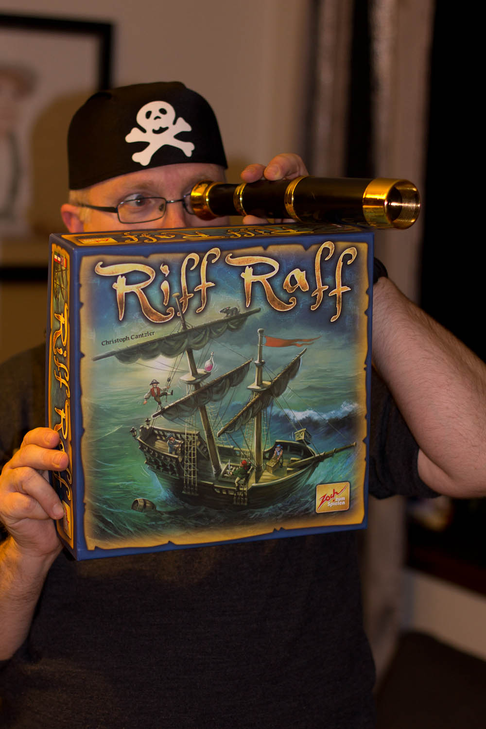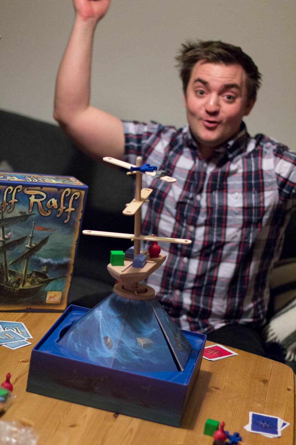 Targi var snart ferdig da Sveinmain tok opp Riff Raff, PGs hyggeligste nykommer av et spill. Og med 3 spillere gikk det raskt. Regler forklart på 10 sekunder og dermed bars det på bøljan det blå. Balansespill har alle prøvd før, men det er taktikken i dette spillet som gjør det unikt. Skal jeg spille høyt kort og satse på å legge på tidlig før det raser, eller legge lavt kort og satser på at andre velter skuta i mellomtiden. Mange harde valg og mye, mye moro. Såpass moro at jeg ikke husker hvem som vant og tapte, og det er sjelden.