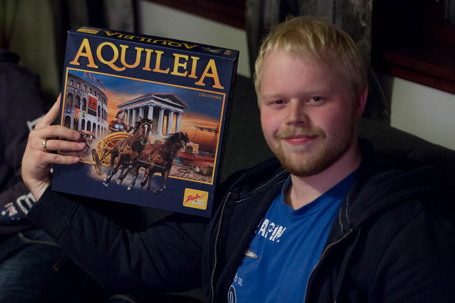 Så til Aquileia. Fargene her er grusomme, det er det ikke å legge skjul på. Og opplæringen her er tung, siden alle plassene er tilgjengelig fra starten av. Pift falt ut lenge før på grunn av fargene, mens Skillz holdt hodet kaldt hele veien. Metallurgen var enig med Pift, at det så ille ut. Men vi kom i gang, dog litt tregt, og gjorde en første runde. Kampene i arena og stadium gikk fint, og er kanskje det mest interessante med spillet, der spillerne matcher opp styrke mot hverandre. Spesielt stadium er artig, der belønningen handler om hvilken side man er på. Dette er worker placement, men det har et par unike tvister på hva handlingene gir, blant annet mulighet til å stjele penger. Metallurgen var flink til å sanke ressurser (gull, sølv, kopper, slaver) og hadde et rolig seilas. Pift slet med å klatre på poengstigen, mens Takras lå langt fremme i begynnelsen. Mot slutten hadde alle skjønt opplegget med pengeflyten og viktigheten av å ha forskjellige valører. Metallurgen var virkelig frempå mot slutten, sammen med Skillz. Det ble en tett kamp, og så var det sluttelling.