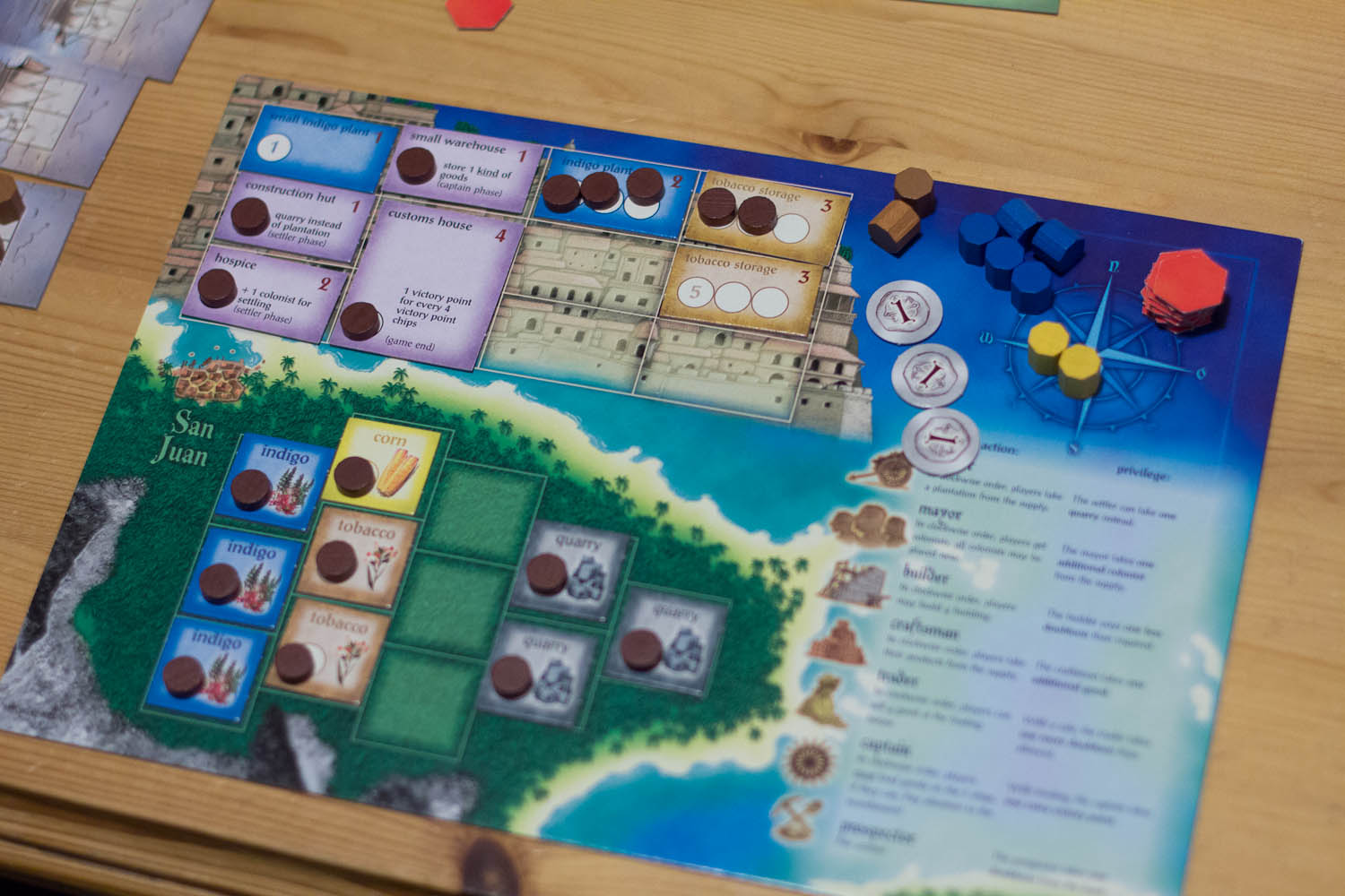 Det skader ikke med noen klassikere av og til. Shogun hadde akkurat rundet første året, og ferja nærmet seg. Puerto Rico sa 90 minutt på eska, og vi hadde 50. Vi tok en sjanse. Raskt ut og på plass på bordet. Posene var porsjonert fra før til 3 spillere, så det var kjapt å få det frem. Pift mente han husket smaken, men fant fort ut han hadde glemt hvordan retten var tilberedt. Skillz og Takras hadde prøvd det før mot hverandre på sjakk-metoden med ett trekk av gangen omtrent ett trekk hver dag. Nå var det fysiske komponenter og «live». Begynnelsen gikk litt sakte, det var litt å sette seg inn i. Alle byggene og mulighetene. Skillz satset sterkt på kaffe og stenbrudd, og Takras på Indigo, senere tobakk, og stenbrudd på veien. Pift hadde litt av hvert, og hadde etter hvert sukker. Negerne sydhavsfolkene kolonistene var det mange av for alle, så det ene poengbygget var attraktivt. Takras innhentet mange poeng underveis ved å velge kapteinfasen, og var ofte den eneste som tjente på dette. Men Pift tjente rått med penger på markedet, og det lå lenge sperret for både Takras og Skillz til å selge ting. Sluttellingen nærmet seg, og det var god tid igjen. (politiske korrekte PG??)