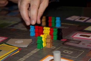 Så skulle det bli i Kolejka også. Først skulle alle stille seg i kø på brettet med mennene sine. Så ankom 3 lastebiler med varer til max 3 av de 5 ulike butikkene hvor horder av brikker hadde samlet seg. Så kom spillets desidert største høydepunkt. Køhopping. I den tidligere