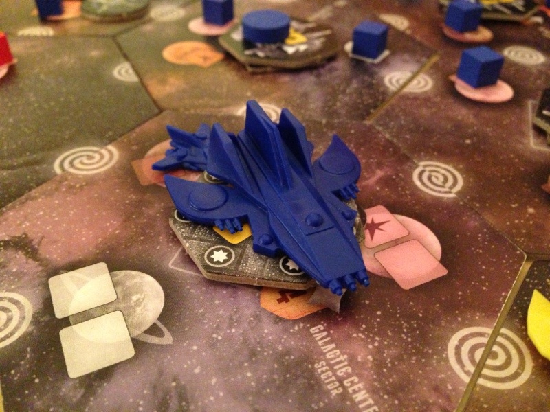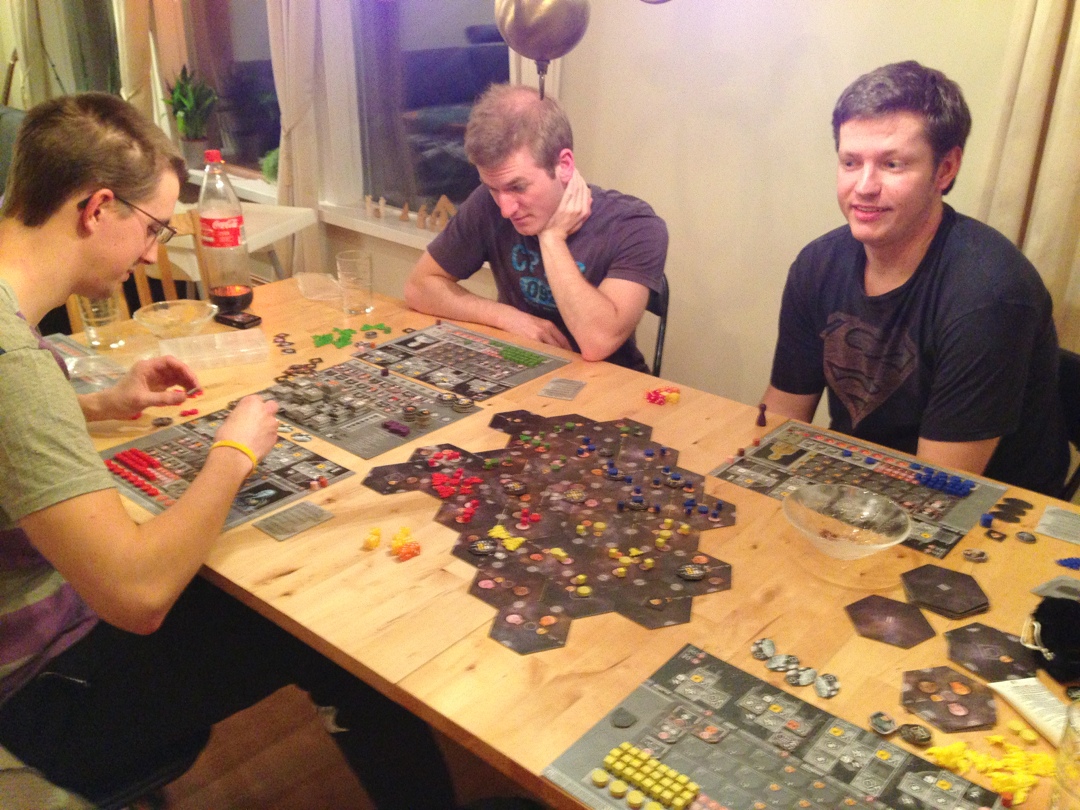 Jeg hadde med meg noen ordentlige gode spill, og Tzolk’in fristet husverten, men ikke de andre to. Mage Knight var fristende for dem, men Andreas ville helst ta noe som alle kunne fra før. Da var det godt jeg hadde med Eclipse også. Ingen debatt mot det, og det var fort opp med eska, komponentene og en meget kjapp oppfriskning av rasene. Jeg ble planterasen, og fant fort ut at mine skip aldeles ikke var å skryte av. Jeg var derfor rask med oppgradering og utforskning, og fikk meg de første kampene med bonusbrikker – og ikke minst ryktepoeng verdi 4, 4, 3, som jeg ikke byttet ut resten av spillet.