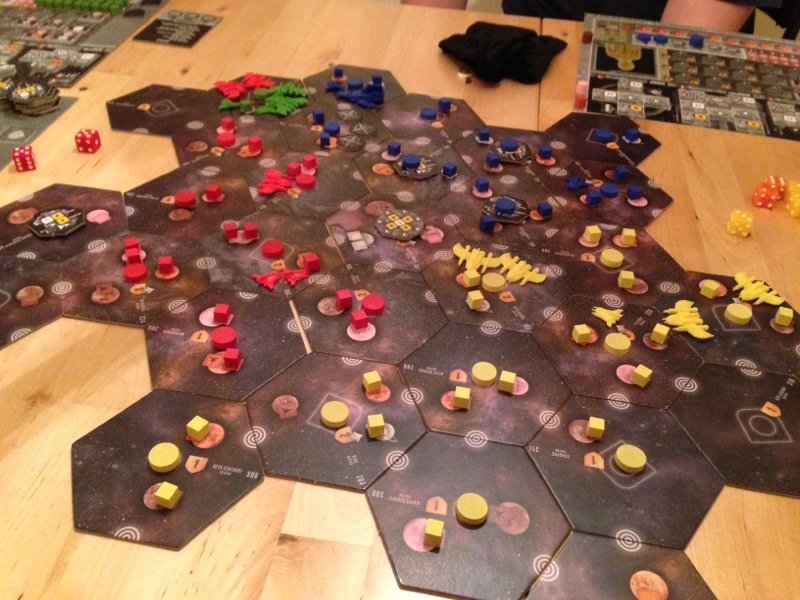 Mot slutten gjorde jeg det utenkelige, og ofret 27 poeng i form av penger og produksjon, for å kjøpe meg Wormhole Generator. Det skapte store reaksjoner fra bordet. Plutselig hadde jeg tilgang til både Andreas og Stigs bakgård, og helt uten motstand. Mine skip kunne i tillegg flytte 4 felt som takk for noe jeg utforsket. Stig var rask til å ofre sin teknologi på å bygge skumle romstasjoner i forsvar. Andreas var usikker, men Takras inngikk allianse med ham veldig fort. Jeg anså ham som den skumleste fienden poengmessig, men det var Stig som kunne utslette meg om han ønsket. Derfor var det viktig for meg å få den generatoren før ham. De andre hadde ikke råd. Det ble mange kriger og bytter av territorier denne runden. Steinar ble eliminert i runde 8, og kjøpte seg i runde 9 en teknologi som ga han 1 poeng i sluttelling, og passet resten av spillet. Andreas følte seg ikke trygg på meg, spesielt ikke etter at han hadde gått inn og tatt «GCDF» i midten. Men jeg var bare føre var, og hadde planlagt å gå mot Stig nok en gang. Jeg turte ikke ta Traitor-kortet som ga meg -2 poeng, ikke at det har hatt så mye å si de andre gangene jeg har spilt.