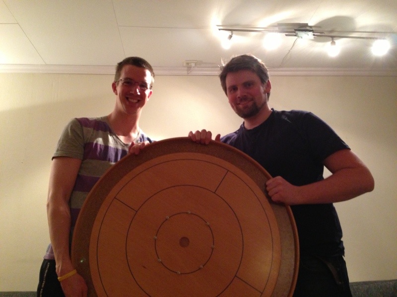 Avslutningsvis ble det Crokinole. Andreas hadde et kjempefint bord med gode brikker og strøken overflate. Stig og jeg mot de andre to. Steinar fikk en kjapp innføring av spillet, mens vi andre hadde spilt det før. Det var ingen tvil at Steinar hadde spilt det før. Han hadde god kontroll på sine brikker, og bommet bare sjeldent. Men Stig og jeg var et godt team, og holdt de andre nede så godt vi kunne, og vant over dem. Omkamp! Og denne gangen var det større konkurranse. I siste runde hadde de allerede senket en 20-poenger, og om de klarte å holde flest på brettet så hadde de flest poeng totalmessig. Men presset ble for stort for Andreas, som kastet bort sin siste brikke på ingenting. Steinar klarte ikke levere han heller, og jeg to bare bort en ubetydelig brikke for å sikre seieren.