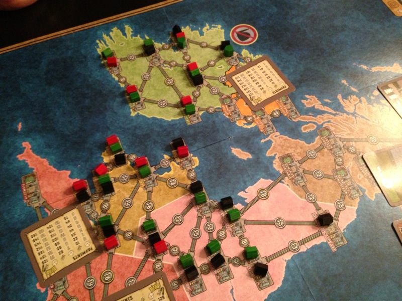 Så kom en annen favoritt på bordet, Egizia. Dette spillet har også tatt PG med storm de siste månedene. Sette ut skip, samle varer og mat i vakre omgivelser. De gule kortene med varig effekt har blitt populære, så det ble hard kamp om de. Black Ant sikret seg en del av disse, men fikk nesten ikke mulighet på noen sfinx-kort. Derimot tappet han hver runde Hollender og Saulius for kostbare poeng med sin sultstrategi! Saulius hadde ledet store deler av spillet, men hadde noe som gav ham bonus på slutten. Så ble han først passert av Hollender før Black Ant satte inn en sterk spurt. Black Ant fikk mange poeng for ikke brukte steiner og 9 poeng for sitt bidrag i gravene. Dette i kombinasjon med skaden han hadde påført Hollender og Saulius underveis førte til en solid seier.