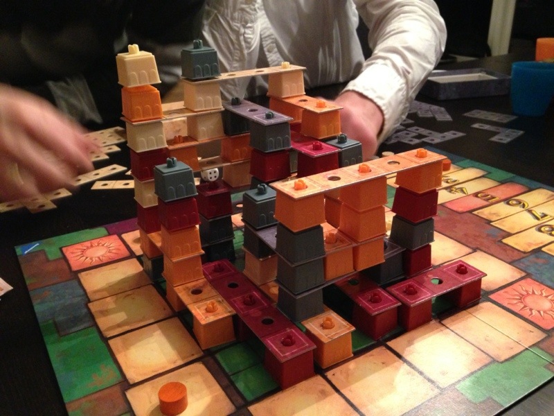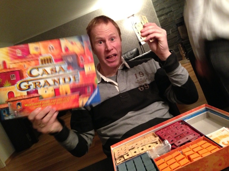 De andre var ferdige også og som en avslutter på en kjekk kveld tok Sveinmain hele gjengen med til Casa Grande. I Casa Grande har enkle regler: 1. Flytt brikken din 2. Bygg en pilar på rekka brikken din står på. 3. Hvis du kan, sett en blokus-lignende figur oppå pilarene dine der det er uthevet på brikken din og ta penger for antall felt gange hvilken etasje du bygget på. Så enkelt, så greit, men likevel så vanskelig. Like moro hver gang dette skjer i PG, men PG-SYNDROMET herjet igjen i dette spillet. De enkleste spill blir plutselig fryktelig vanskelige. Denne gangen var det Saulius som slet med spillets 3 regler. Vet ikke hva det er, men det skjer ofte!!! Men vi andre fikk sving på byggingen og Casa Grande økte i omfang og høyde etterhvert som spillet skred frem. Det tok ikke lang tid før blokeringer og taktikkeri preget spillet, og en måtte bygge der en ikke ville for å blokkere andre. Etterhvert ble bygget såpass høyt at en måtte stå å spille, uten at det satte en demper på opplevelsen. Etter en snau time var det telling, og det gikk som alle trodde at Sveinmain vant, selv om Takras var utrolig nær å ta rotta på han. 1 Sveinmain 145, 2 takras 131, 3 Hollender 85, 4 Saulius 83