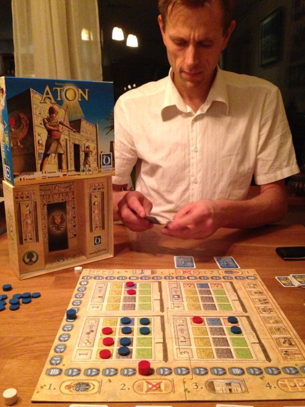 Hollender inviterte Takras til en kveld med barna, og med Takras’ mystiske sekk, er det alltid noe spennende på lur, også for de voksne. De var ikke helt ferdige med TV-programmet sitt, så Takras fant frem et dedikert tomannsspill, nemlig Aton. Her skal store guder kjempe med alt de har om tilbedelse fra menneskene. Og hvordan gjøres det?! Legge noen sirkler i noen firkanter. Et totalt abstrakt spill forkledd som noe Egyptisk, og dermed var oppmerksomheten til Hollender på plass. Et enkelt spill med ganske få handlinger, men til tider vanskelig valg, spesielt når valgene gjøres skjult, og avsløres samtidig. En god del flaks i dette spillet, men også en god del kontroll over områdene sine. Det hele var fort over, og Hollender viste nok en gang sin brillianse i områdekontrollspill.
