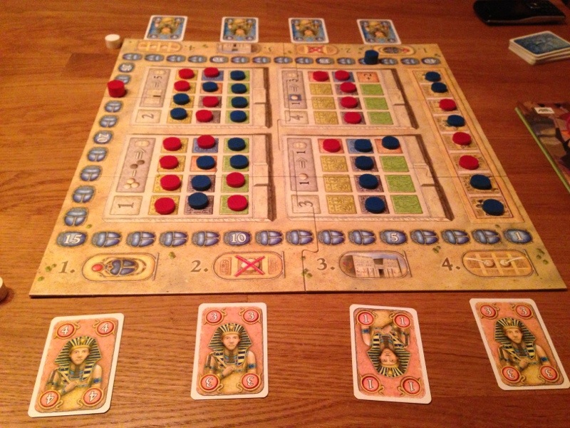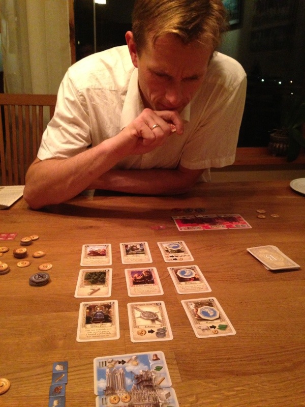 Så ble det en ny dedikert tomanns for Hollender og Takras. Nemlig Pillars of the Earth: Builders Duel. Hollender var meget skeptisk til en mekanisme han leste om i regelheftet, nemlig det å flippe en mynt. I spillet her skal vi legge brikker over noen kort vi ønsker å aktivere, og det vil bestandig være et kort som begge spillerne vil ha. Dette skal da kjempes om ved hjelp av myntkasting. Noen mynter har verdi 1 på en side og 5 på andre, 2-4 og 3-4, for eksempel. Så må det kjøpes inn nye mynter til senere bruk, fordi de vil bli brukt opp. En merkelig mekanisme, men den hadde sin funksjon. Om spillet spilles ofte nok, vil det være lettere å forutse hva slags kort som finnes og kommer til å komme. Vi brukte tiden på «der og da»-stadiet, og tok det vi kunne. Hollender trakk det lengste strået, og klarte å fullføre katedralen i den aller siste runden.